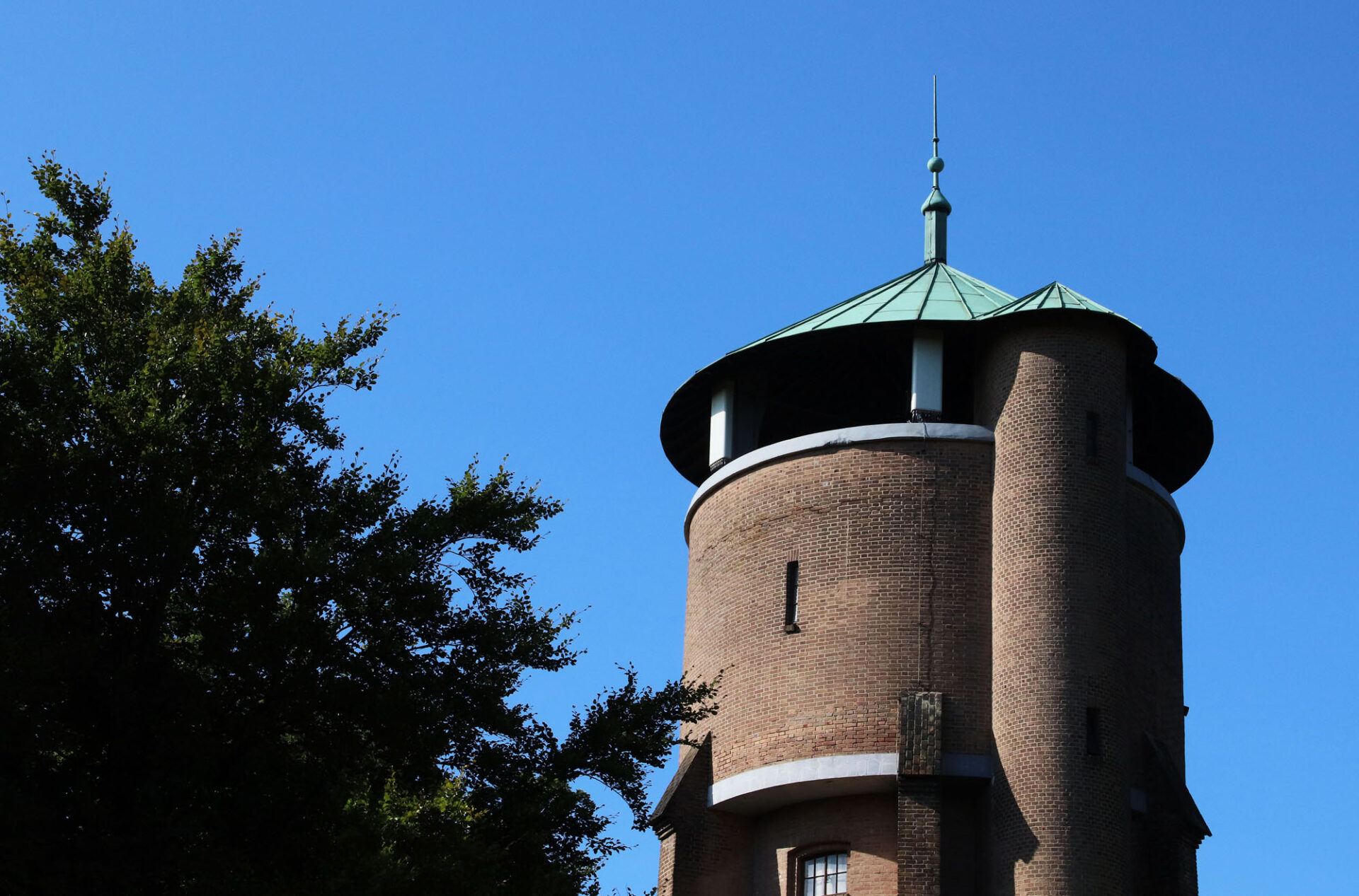 Hoe verschillend bouwstijlen door de tijd heen kunnen zijn blijkt wel uit de twee opeenvolgende watertorens op Wageningse bodem. De eerste watertoren, beter bekend als Bélvèdere (1898), inderdaad door zijn mooie uitzicht, is een ontwerp van ingenieur en architect Roelof Kuipers (1855-1922). Naast zijn functie voor waterdruk en -opslag is de toren met een open uitzichtplatform in die tijd ook een ware toeristische attractie. De twintig meter hoge toren biedt een weidse blik vanaf de berg op de Rijn en de Betuwe, maar is ook nog eens fraai ontworpen. Op afstand lijkt het een weelderig gevormde kasteeltoren met wapperende vlag, fier boven de bomen uitstekend. De neorenaissance bouwstijl versterkt dat gevoel. Terug naar de 15e, 16e eeuw, met het comfort van eind 19e eeuw (voor het eerst stromend en schoon drinkwater uit de kraan!). De Bélvèdere raakt helaas aan het eind van de Tweede Wereldoorlog onherstelbaar beschadigd en moet worden gesloopt. Op dezelfde locatie verrijst in 1948 een waardige opvolger: hoger, ranker en bovenal soberder. Dertig meter lang met opnieuw een uitzichtplatform, dit keer overdekt met een groen geoxideerd koperen tentdak. Verantwoordelijk voor de ranke ronde toren is Theodoor K.J. Koch (1902-1985). Deze in Delft opgeleide architect werkt in de Delftse schoolstijl. Onder meer als reactie op de uitbundige en decoratieve Amsterdamse schoolarchitectuur. Sober, harmonieus en traditioneel, dat is de Delftse schoolstijl in een notendop. Geen overbodige opsmuk, maar een eenvoudige uitstraling met het traditionele baksteen als bouwmateriaal, de moderne betonnen constructie is zo aan het zicht onttrokken. Tijdens Open Monumentendagen mag de watertoren beklommen worden en telkens weer blijkt deze solide Wageningse ‘peperbus’ een trekpleister van formaat.