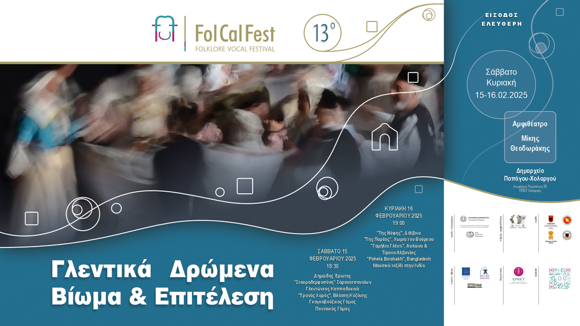 Το Δ.Σ. του Ερευνητικού Κέντρου Ελληνικού Τραγουδήματος [ΕΡ.Κ.Ε.Τ.] και η καλλιτεχνική επιτροπή του FolCalFest, ανακοινώνουν την πραγματοποίηση του “13ου FolCalFest | Γλεντικά Δρώμενα: Βίωμα & Επιτέλεση” στον Χολαργό. Το φεστιβάλ είναι διήμερο και θα πραγματοποιηθεί στο Αμφιθέατρο “Μίκης Θεοδωράκης” στο Δημαρχείο Παπάγου-Χολαργού: α) το Σάββατο, 15 Φεβρουαρίου 2025 και ώρα 6:30-10:45 μ.μ. και β) την Κυριακή, 16 Φεβρουαρίου 2025, και ώρα 7:00-10:45 μ.μ.