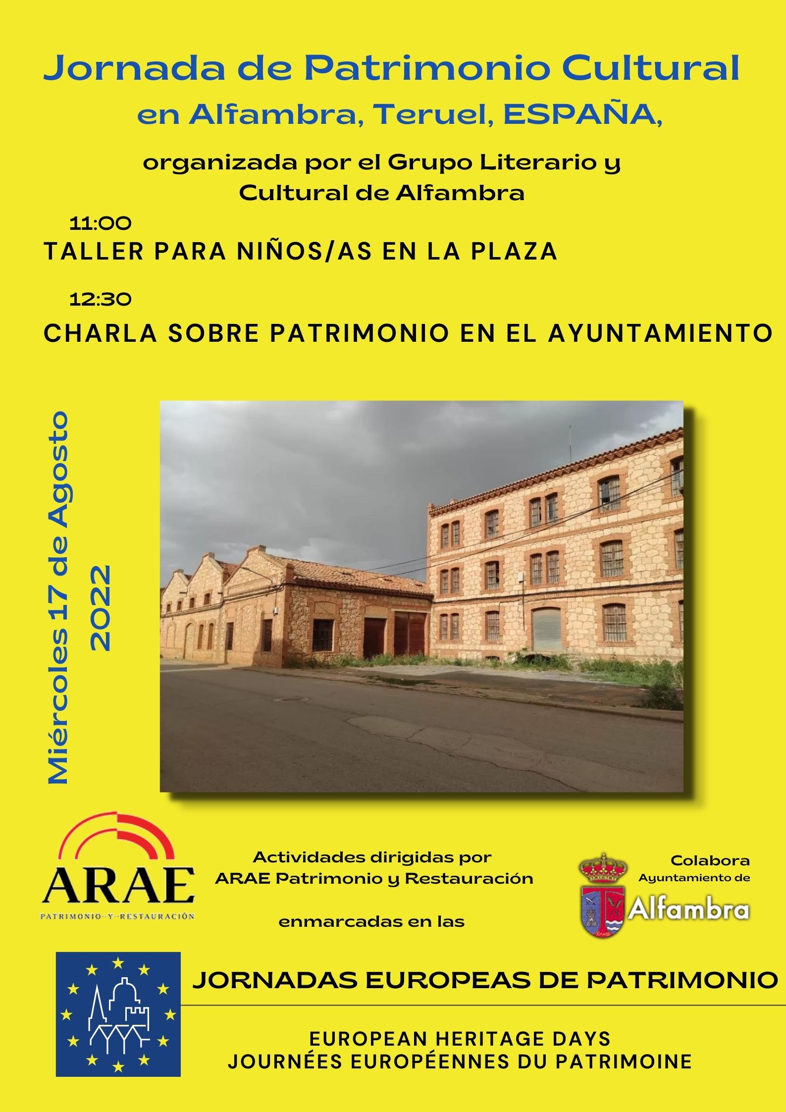 La primera Jornada de Patrimonio de Alfambra tiene por objetivo dar visibilidad a la importancia del patrimonio cultural de los municipios rurales, así como crear conciencia de su valor y potencial entre la ciudadanía. La jornada promovida en colaboración con el Grupo Literario y Cultural de Alfambra se enmarca en las Jornadas Europeas de Patrimonio y contará con la participación de ARAE Patrimonio y Restauración, expertos en la conservación y la divulgación del patrimonio.
