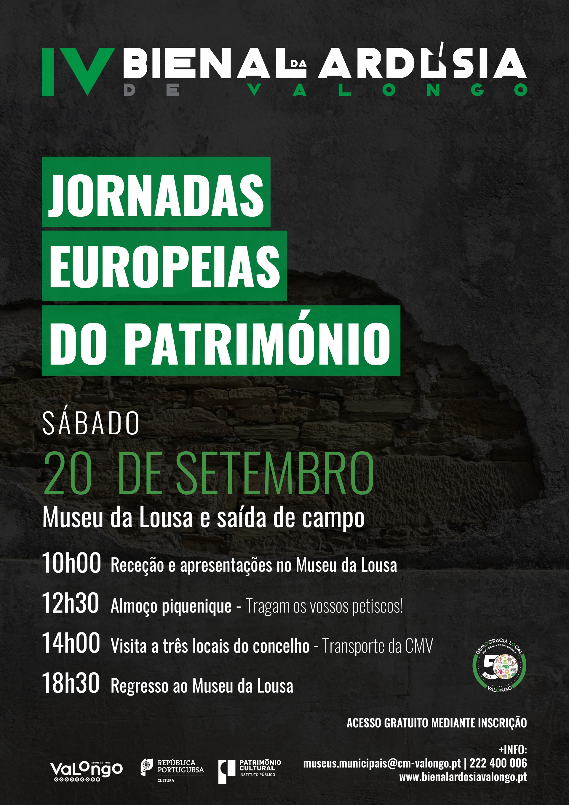 Este ano a ideia orientadora é “Património Arquitetónico: Janelas para o Passado. Portas para o Futuro”, pelo que o Município de Valongo se associa às JEP com a realização, de um encontro a decorrer no dia 20 de setembro, sábado, no Museu da Lousa, De manhã haverá apresentações, visita guiada ao museu e oficinas. De visita a três locais do concelho onde se admirará o património natural e construído, baseado no complexo xisto-grauváquico do território de Valongo: Couce + quartzitos; Lugar de Ferreira em Sobrado + grauvaques e Susão em Valongo ´lousa e xisto. Haverá transporte da edilidade para o transporte aos locais indicados, Tragam farnel e vamos passar um dia diferente.