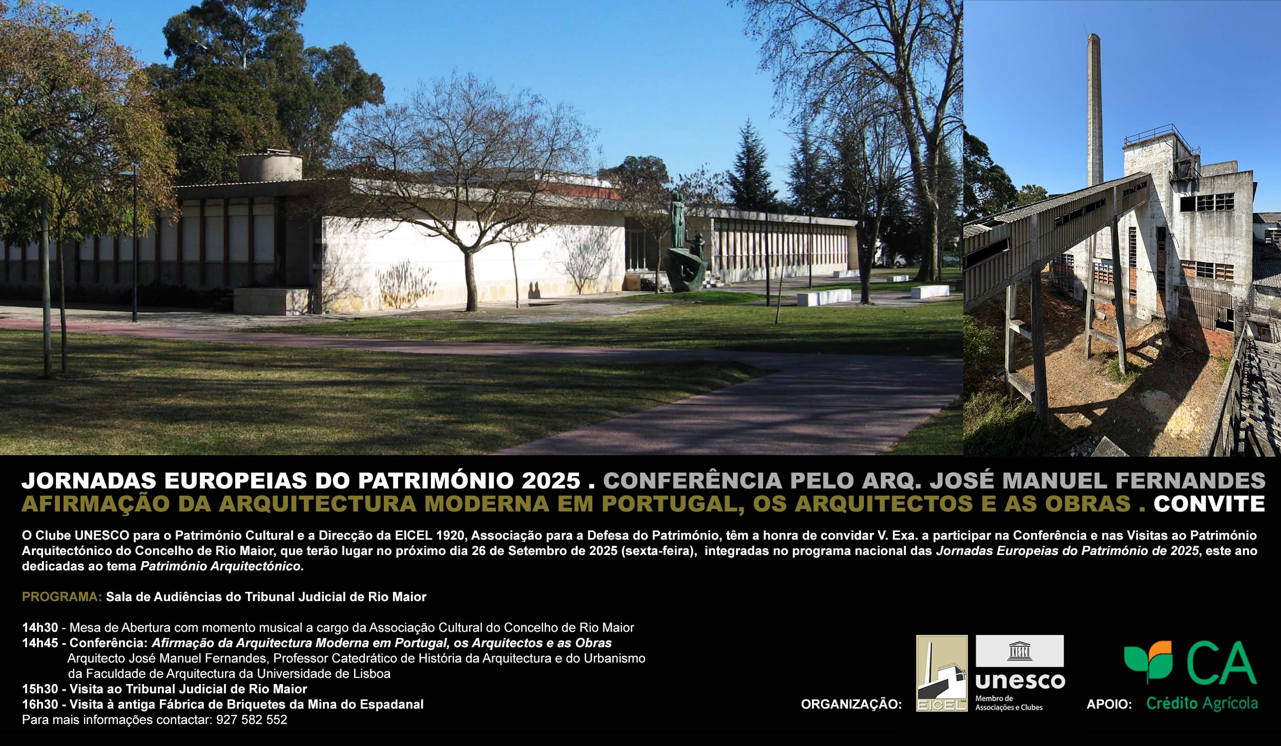 O Clube UNESCO para o Património Cultural e a Direcção da EICEL1920, Associação para a Defesa do Património, têm a honra de convidar V. Exa. a participar na Conferência e nas Visitas ao Património Arquitectónico do Concelho de Rio Maior, que terão lugar no próximo dia 26 de Setembro de 2025 (sexta-feira), integradas no programa nacional das Jornadas Europeias do Património 2025, este ano dedicadas ao tema: Património Arquitectónico. Programa: Sala de Audiências do Tribunal Judicial de Rio Maior 14h30 - Mesa de Abertura com momento musical a cargo da Associação Cultural do Concelho de Rio Maior. 14h45 - Conferência: Afirmação da Arquitectura Moderna em Portugal, os Arquitectos e as Obras, pelo Arquitecto José Manuel Fernandes, Professor Catedrático de História da Arquitectura e do Urbanismo da Faculdade de Arquitectura da Universidade de Lisboa. 15h30 - Visita ao Tribunal Judicial de Rio Maior. 16h30 - Visita à antiga Fábrica de Briquetes da Mina do Espadanal. Este evento tem o Apoio de Crédito Agrícola. Para mais informações, contactar: 927 582 552.
