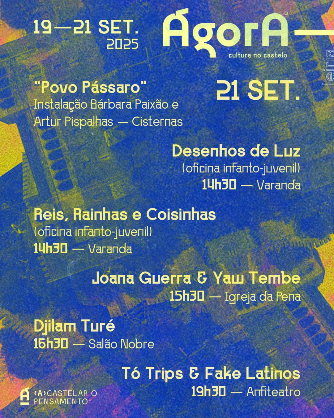 Atividades várias 21 setembro 09h30 - "Povo Pássaro"- instalação Bárbara Paixão e Artur Pispalhas - Cisternas 14h30 - Desenhos de Luz (oficina infantojuvenil) - Varanda 14h30 - Reis, Rainhas e Coisinhas (oficina infantojuvenil) - Varanda 15h30 - Joana Guerra & Yaw Tembe - Igreja da Pena 16h30 - Djilam Turé - Salão Nobre 17h30 - Tó Trips & Fake Latinos – Anfiteatro Entadas sujeitas à lotação dos espaços do Castelo de Leiria.