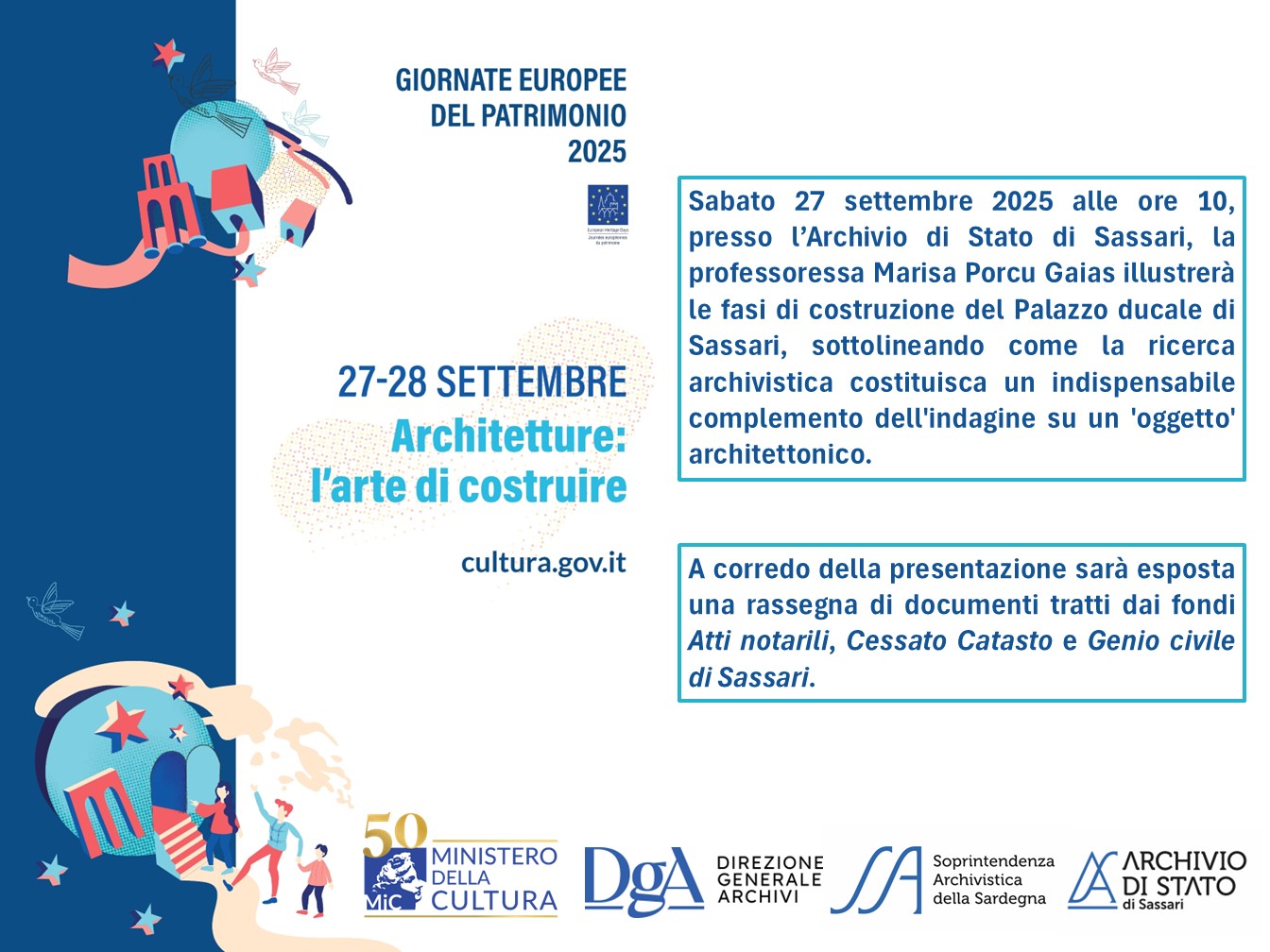 In occasione delle Giornate Europee del Patrimonio 2025, sabato 27 settembre 2025 alle ore 10, presso l’Archivio di Stato di Sassari, la professoressa Marisa Porcu Gaias illustrerà le fasi di costruzione del Palazzo ducale di Sassari, sottolineando come la ricerca archivistica costituisca un indispensabile complemento dell'indagine su un 'oggetto' architettonico. A corredo della presentazione sarà esposta una rassegna di documenti tratti dai fondi Atti notarili, Cessato Catasto e Genio civile di Sassari. © 2021 MiC - Pubblicato il 2025-09-10 12:09:54 / Ultimo aggiornamento 2025-09-12 08:49:19
