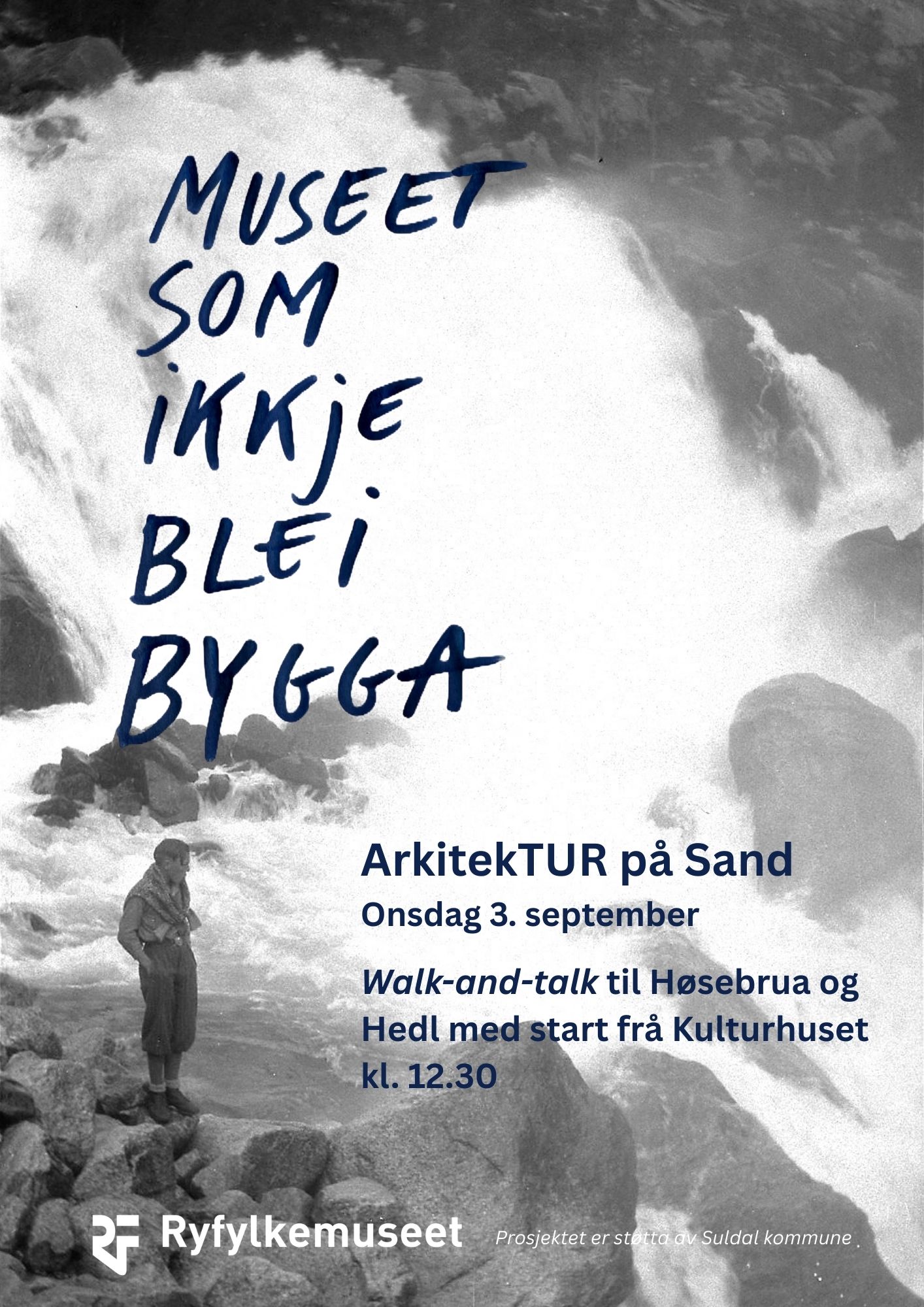 I 1994 teikna arkitekt Sverre Fehn skisser til det som skulle bli Norsk Vassdragsmuseum på Sand i Suldal. Museet skulle løfta fram vassdragskulturen og vasskrafta si rolle i utviklinga av lokalsamfunnet. Prosjektet fekk brei merksemd og var tenkt som eit landemerke for både Suldal, vasskrafta og for norsk arkitekturhistorie. Likevel vart planane aldri realiserte. Me møtast på Kulturhuset kl. 12.30 for ein walk-and-talk tur mot Hedl og tomta der museet ikkje blei bygga. Undervegs skal me snakka om kva som faktisk blei og kva ønsker, håp og draumar me har for arkitekturen i Suldal i framtida.
