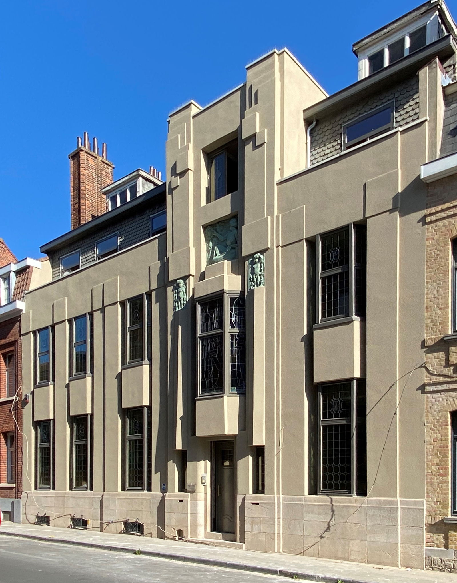 Dit herenhuis liet de modernistische architect Pierre Verbruggen in 1920 voor zichzelf bouwen. De woning wordt door architectuurhistoricus prof. Francis Strauven (UGent) in het boek "Art Deco Architectuur Brussel" beschreven als één van de vroegst aanwijsbare voorbeelden van art-deco in België . Pierre Verbruggen was voor de oorlog atelierhoofd geweest bij Hamesse waar hij van nabij vertrouwd was geraakt met de Sezession. De bouwelementen die hij voor deze woning aanwendde zijn terug te vinden bij Olbrich, Hoffmann en Mackintosh, maar door het kloeke karakter dat ze hier aannemen kan niet meer van art nouveau worden gesproken. De gevel wordt gesierd door drie bas-reliëfs in een expressieve stijl, gesigneerd door Dolf Ledel in 1922. Deze samenwerking illustreert de nauwe band tussen architectuur en beeldhouwkunst in het interbellum. Ledel, bekend om zijn expressieve stijl, leverde met deze gevelsculpturen een belangrijke bijdrage aan het artistieke karakter van Verbruggens woning. De woning is sinds 1983 beschermd erfgoed.