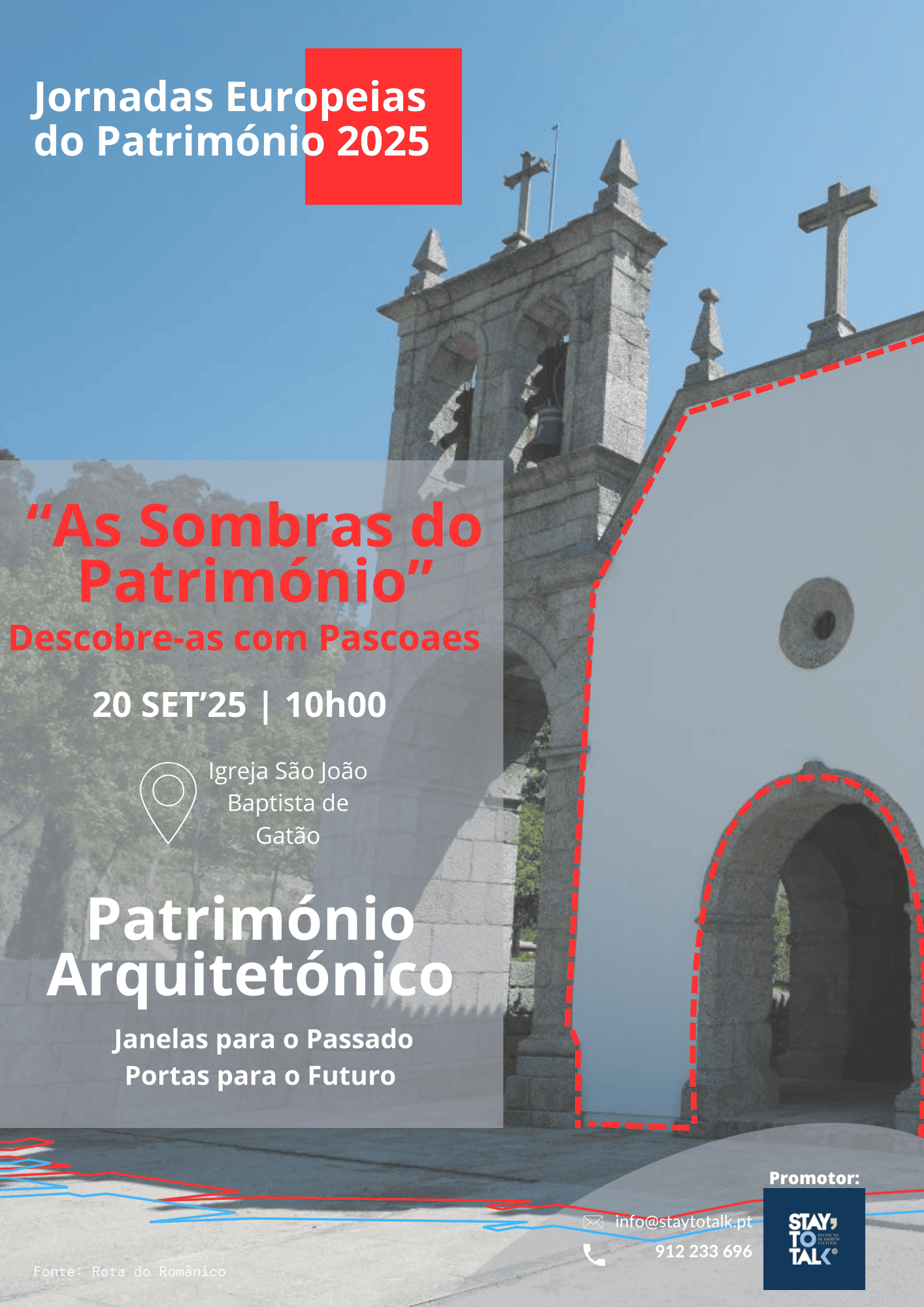As Jornadas Europeias do Património são uma iniciativa do Conselho da Europa e da Comissão Europeia que pretendem celebrar o diverso património cultural das cidades, regiões e pessoas da Europa. O tema deste ano é “Património Arquitetónico. Janelas para o passado. Portas para o futuro”. Como já é tradição o Stay to Talk Instituto de Imersão Cultural irá participar nesta iniciativa de dimensão europeia, propondo uma atividade dedicada à arquitetura que inspirou o poeta Teixeira de Pascoaes. Escolhemos a aldeia de Pascoaes e iremos explorar as linhas arquitetónicas da Igreja de Gatão, assim como, outras estruturas que fizeram parte da vida e obra do poeta. Será uma manhã dedicada à família, à exploração, aventura e partilha entre pais/filhos e avós/netos. Esperamos por si e pela sua família!