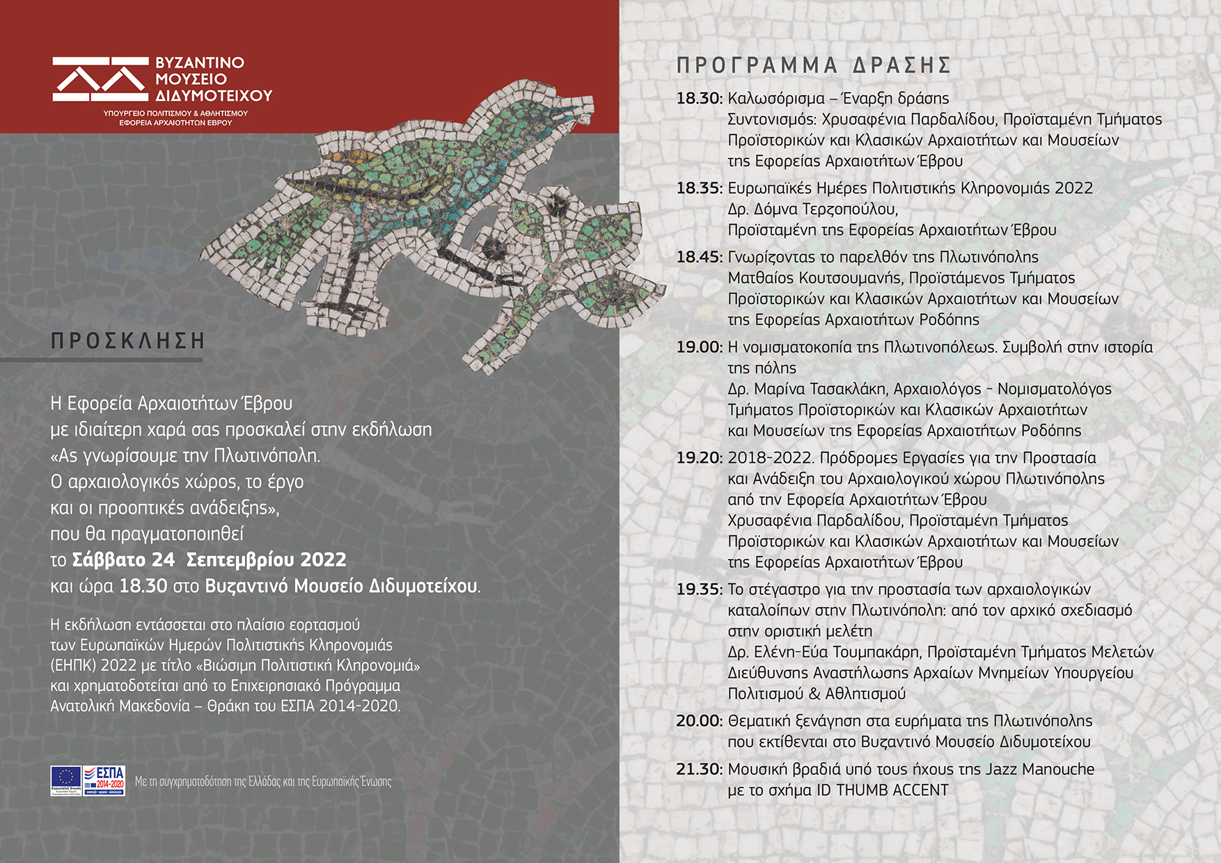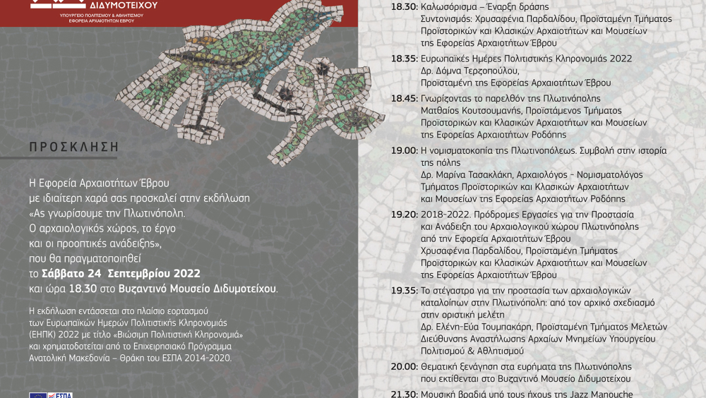 ‘Let’s meet Plotinopolis. The archaeological site, the projects and promotion prospects’ at the Byzantine Museum of Didymoteicho - by the Ephorate of Antiquities of Evros. The event will include talks about the archaeological site of Plotinopolis and the work executed there, guided tours at the findings of the site currently exhibited in the Byzantine Museum of Didymoteicho as well as a music event in the evening under the sounds of Jazz Manouche (Gypsy Jazz).