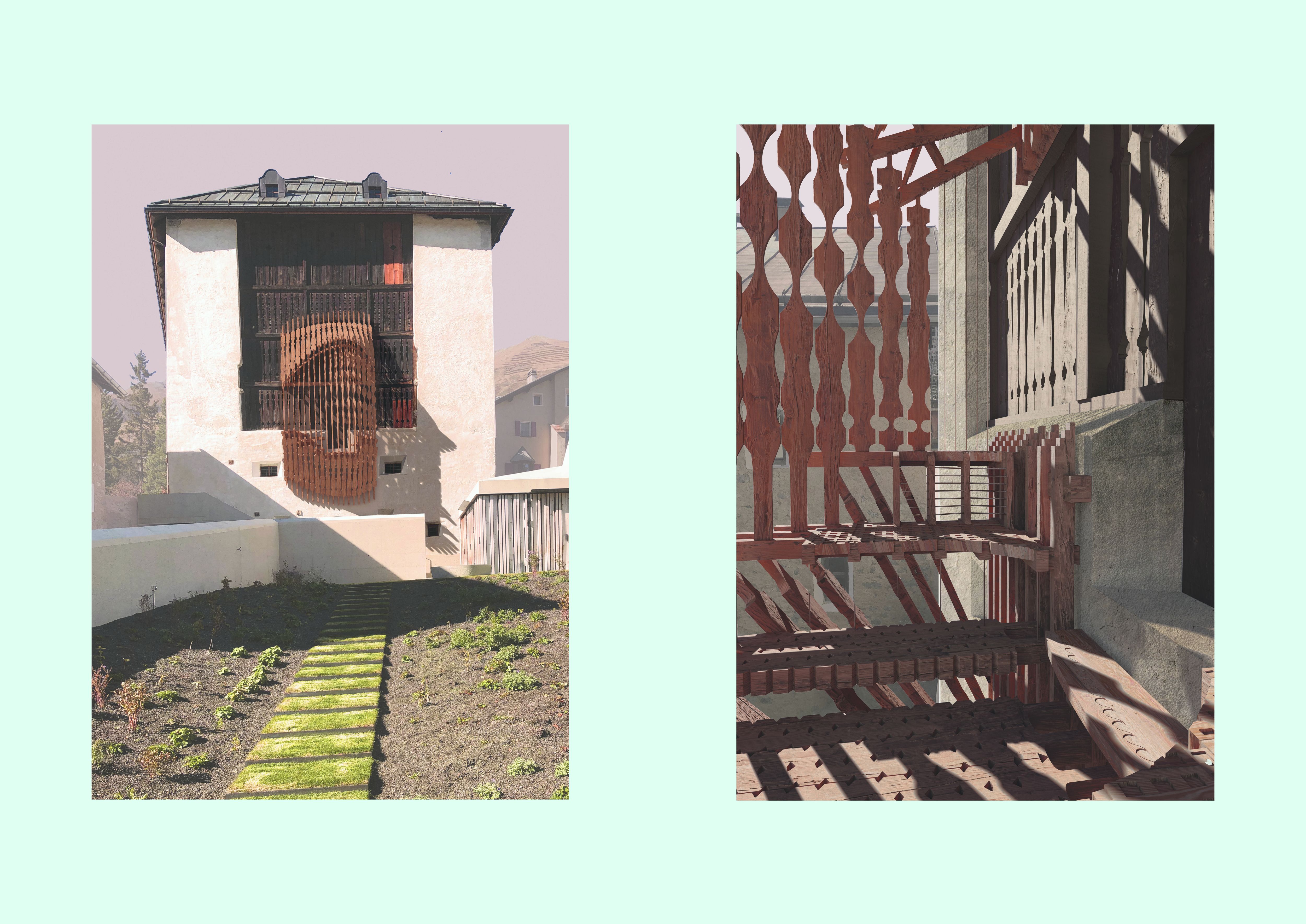Wie lässt sich der Charakter eines historischen Orts weiterbauen, ohne ihn zu verfälschen? Die Chesa Gregori in Zuoz: Nahtstelle zwischen dichtem Dorfkern und jüngerer, landschaftsorientierter Bebauung, liefert das Versuchsfeld. Neu gedacht wird hier ein «balcun tort», der einzige Baustein der Engadinerhäuser, der schon immer demonstrativ nach außen zeigte und soziale Blickachsen band. Das 1:1 Modell zum Entwurf wurde in S‑Chanf aus Resthölzern CNC‑gefräst, leim‑ und metallfrei nur gesteckt gefertigt. Traditionelle Zimmermannsverbindungen treffen auf digitale Fabrikation; algorithmisch variierte Ornamente abstrahieren lokale Ornamentmotive, jedes Bauteil ist kommt nur einmalig vor. So verknüpft das Projekt Denkmalpflege mit moderner Kreislaufwirtschaft: Es rehabilitiert den verlorenen Dialog zwischen Innen‑ und Außenraum, Dorf und Landschaft, Vergangenheit und Gegenwart, in der Forschungsarbeit auch Planung, Entwurf und Bau und zeigt, wie Engadiner Handwerkstradition durch digitale Werkzeuge weiterschreiben lässt, ohne ihren Kern einzubüssen.