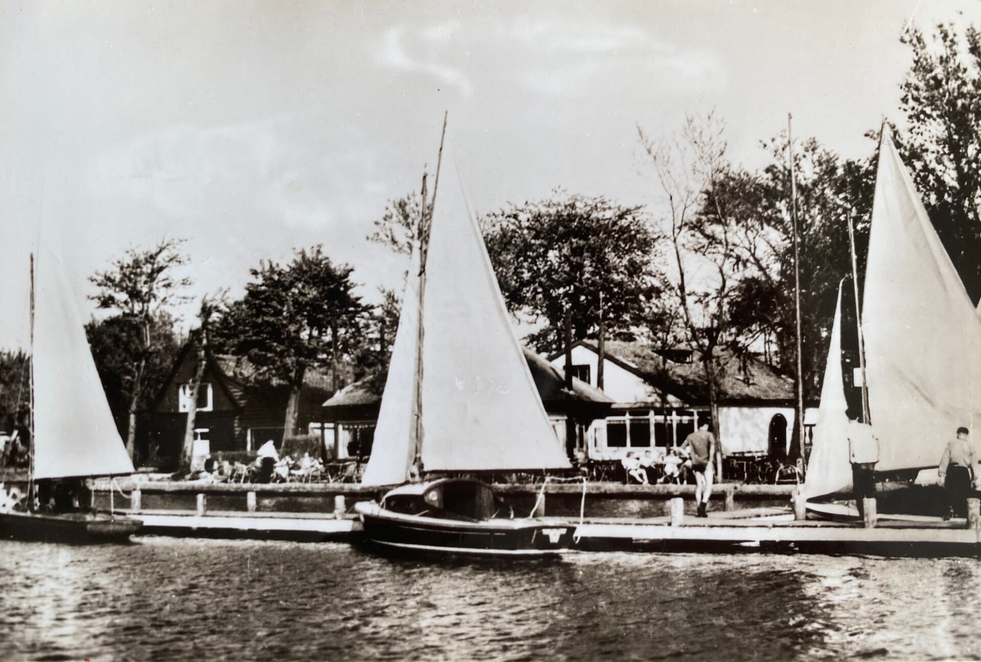 Met de komst van de eerste toeristen, eind jaren dertig van de vorige eeuw, maakte Dirk van Nieuwkoop samen met zijn vrouw Aida Obles van een oude koeienstal met hooiberg aan de waterkant een bijzonder cafébedrijf, Het Kompas, met terras en aanlegsteiger (zie foto 1945). Op Bevrijdingsdag 5 mei 1945 wordt er voor de buren in alle vroegte een borreltje geschonken… Samen met het naastgelegen café De Bontekoe beleefden deze etablissementen hun glorietijd in de jaren zestig met optredens van de Dutch Swing College Band. Kaag was even het centrum van de wereld. In de zeventiger jaren probeerde Ben Ruis, een nieuwe eigenaar, er weer een goed renderend bedrijf van te maken, maar moest eerst toezien dat op 6 november 1972 alles tot de grond afbrandde. De brand werd ‘s nachts ontdekt door Lou Geels (Bromsnor in de tv-serie ‘Swiebertje’) die er pal naast woonde. Daarna is nog menigmaal van eigenaar gewisseld. Op 11 maart 2023 is Restaurant ’t Kompas omgetoverd tot de nieuwe Brasserie Milo. Het begin van een nieuw tijdperk voor deze prachtige locatie.