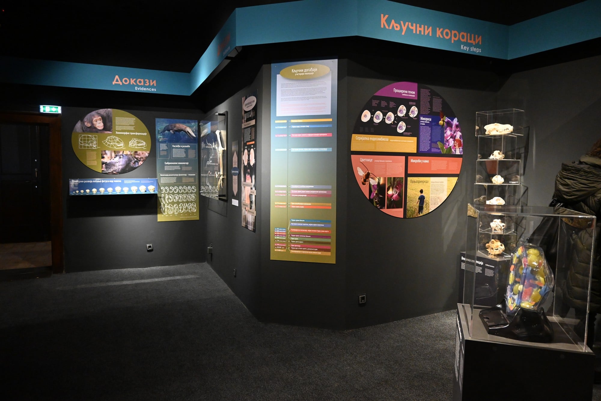 Публика ће имати прилику да види најстарије икада пронађене фосиле настале у праокеанима пре 3,5 милијарди година, најстарије животиње, прве биљке које су се појавиле на копну а неки од ових изузетних предмета су пронађени на територији Србије. Ова изложба је прилика да се публика упозна са кључним материјалним доказима развоја живота на Земљи и види предмете који су расветлили еволуцију људске врсте. Путем атрактивних експоната лобања, цртежа и реконструкција, приказан је еволутивни низ древних предака у еволуцији човека, дуг више од 30 милиона година, међу којима су фосили примата и човеколиких мајмуна и људских врста које су изумрле. Међу њима су и скелети аустралопитекуса Луси, откривеног у Етиопији 1974. године, затим пекиншког и неандерталског човека, али и мало познатог данашњег блиског рођака људи, бонобоа.