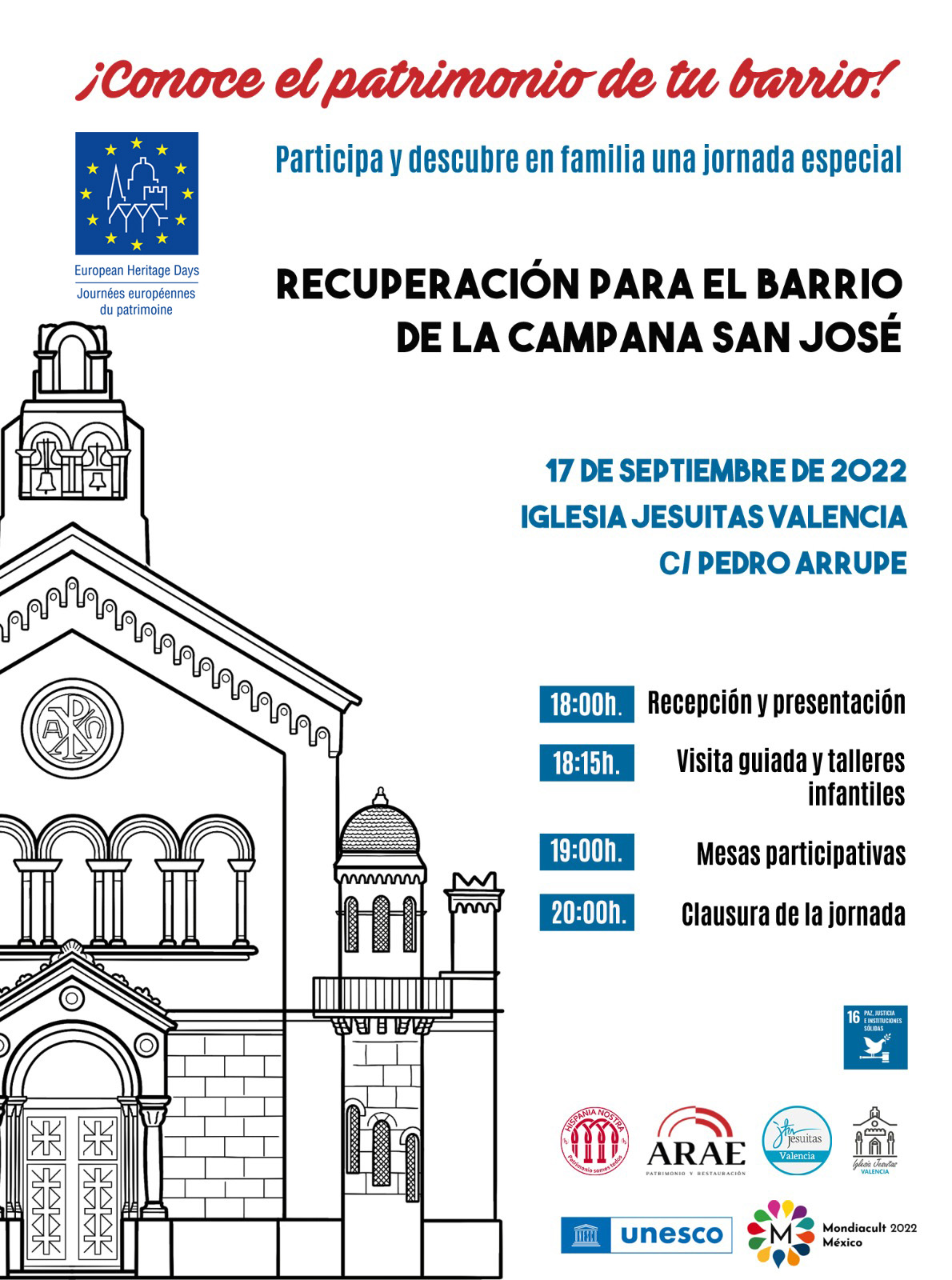 Con motivo de la recuperación de la campana San José de la iglesia de los Jesuitas de Valencia, el sábado 17 de septiembre, de 18.00 a 20.00, tendrá lugar una jornada de puertas abiertas en la que se llevará a cabo una visita guiada por la iglesia y una serie de talleres infantiles y mesas participativas, en las que se invita a los residentes del barrio a conocer su patrimonio.