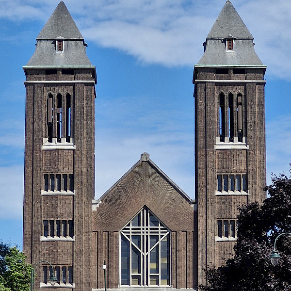 Geographically, Saints-Pierre-et-Paul church was built between the disused Saint-Nicolas church and Saint-Pierre church, of which only the Romanesque tower remains. At the request of the Archbishop’s palace, two powerful towers were added to the facade to commemorate these two monuments to the municipality’s history. Architect Henri-Julien De Ridder designed this powerful building, which rose from the ground in 1935. Modernist in style, it features references to the past, such as the churches of the Mosan region with their two mighty bell towers on the facade. In this case, the reinforced concrete structure is clad in brick, while the interior is covered in plaster. Ample barrel vaulting punctuates the entire width of the single nave. The astonishing clerestory bas-reliefs, like the one on the tympanum of the main entrance, are the work of Paul Stoffijn. Self-guided tour of the church. Bilingual (FR/NL) guided tours of the church and district will be given continuously, starting as soon as a group is formed. Look up in the surrounding streets and you will discover characteristic facades that tell the story of the district’s birth.