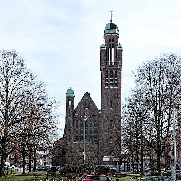 In 1900, architect Émar Collès, co-founder of the Saint-Luc Art Schools in Brussels, was commissioned to build a church in the Helmet district. The choir, transept and one bay of the nave were completed in 1907, but lack of funds prevented the original project from being carried out. Work was not resumed until 1936. It was then entrusted to architect Frans Vandendael, who proposed completing the church in the Art Deco style, rather than the original neo-Gothic style. Like his predecessor, he opted for brick to extend the nave and erect a gabled facade flanked by two towers. Of modest dimensions, the tower on the right contrasts sharply with the striking one on the left, which rises to a height of 60 m. Some compare it more to a belfry than a bell tower. Inside, the black marble high altar, embellished with bas-reliefs, is also typical of the Art Deco style.