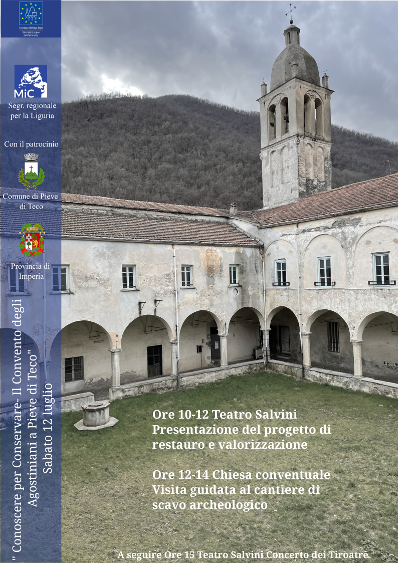 Pieve di Teco (IM) | "Conoscere per conservare - il Convento degli Agostiniani a Pieve di Teco" Alle ore 10 presso il Teatro Salvini avrà luogo la Presentazione del progetto di restauro e valorizzazione del convento degli agostiniani. A seguire, dalle ore 12 alle 14, nella chiesa conventuale verrà tenuta la visita guidata al cantiere di scavo archeologico. Infine, alle ore 15 ancora nel Teatro Salvini, si potrà assistere al Concerto dei Tiroatrè. La partecipazione è gratuita ma è obbligatoria la prenotazione, fino a esaurimento dei posti disponibili. Scrivere a sr-lig.comunicazione@cultura.gov.it entro e non oltre le ore 12 di giovedì 11/7 comunicando nome e cognome, numero dei posti richiesti, recapito telefonico per eventuali comunicazioni di urgenza. La prenotazione potrà essere considerata valida dal richiedente solo se seguita da conferma via e-mail dell’Ufficio Comunicazione del Segretariato regionale MiC per la Liguria. © 2021 MiC - Pubblicato il 2025-07-08 17:19:12 / Ultimo aggiornamento 2025-09-16 08:34:10