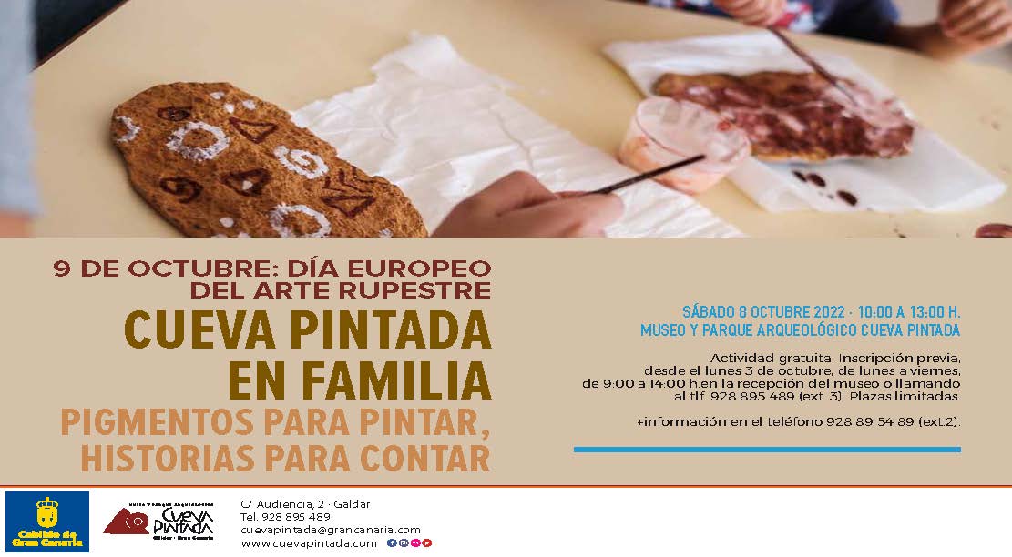 El rojo y el blanco son los dos colores característicos de la Cueva Pintada. Con motivo del Día Europeo del Arte Rupestre, el Museo y Parque Arqueológico de la Cueva Pintada de Gáldar organiza una actividad que invita a las familias a explorar el pigmento del almagre, acompañándolo del color blanco para crear, sobre un soporte rocoso, círculos, triángulos, cuadrados y rectángulos con la finalidad de conocer la técnica con la que se decoró la Cueva Pintada, que constituye un ejemplo de arte rupestre singular en nuestro archipiélago. Actividad gratuita. Plazas limitadas.