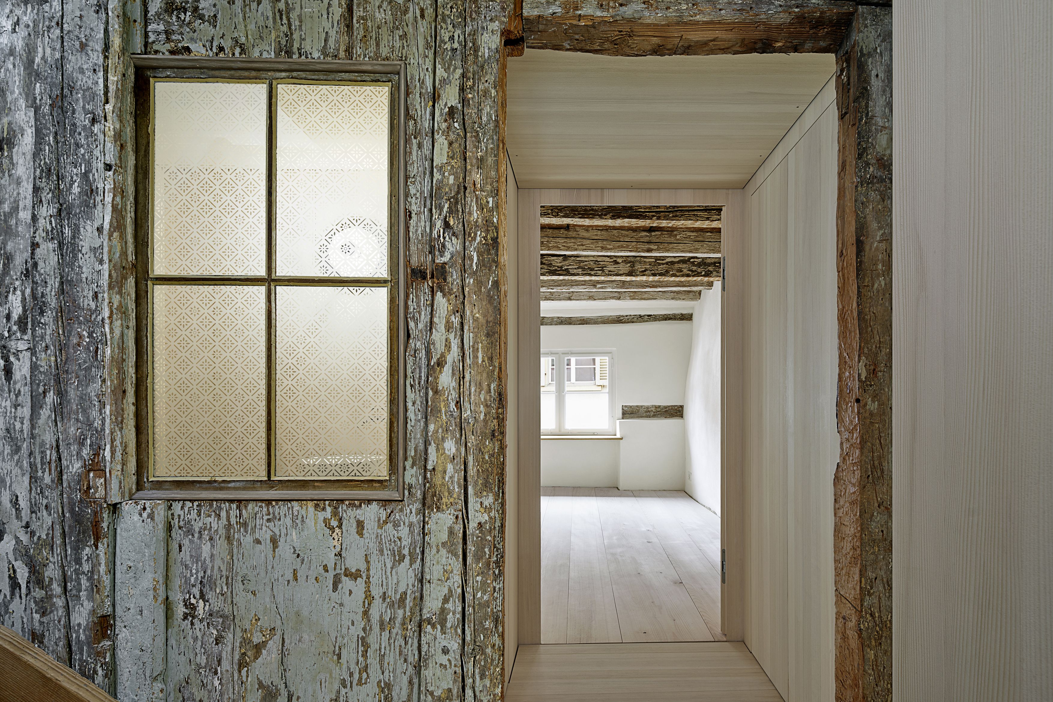 Die Geschichte des denkmalgeschützten kleinen Altstadthauses reicht bis ins Jahr 1329 zurück. Seine bescheidene Ausstattung weist auf seine ursprünglichen Bewohnerinnen und Bewohner hin, Handwerker und Handelsleute. Zu Beginn des letzten Jahrhunderts führten strukturelle Eingriffe zu prägenden Veränderungen und einem partiellen Verlust der originalen Bausubstanz. Mit den 2024/25 erfolgten Restaurierungsarbeiten ist durch das Freilegen der Oberflächen die ursprüngliche Primärstruktur von 1367 wieder sichtbar geworden. Riegelwände, eine Bohlenwand, gotische Blockstufentreppen und Wandnischen aus verschiedenen Epochen erzählen von einer langen Hausgeschichte und seinen Bewohnenden. Durch das Hinzufügen von funktionalen Elementen unter Verwendung historischer und regionaler Baumaterialien wird das Vorhandene respektvoll zu einem neuen Ganzen verwoben. Die Hausgeschichte wird um ein weiteres Kapitel reicher und damit identitätsstiftend und lebenswert auch für kommende Generationen.