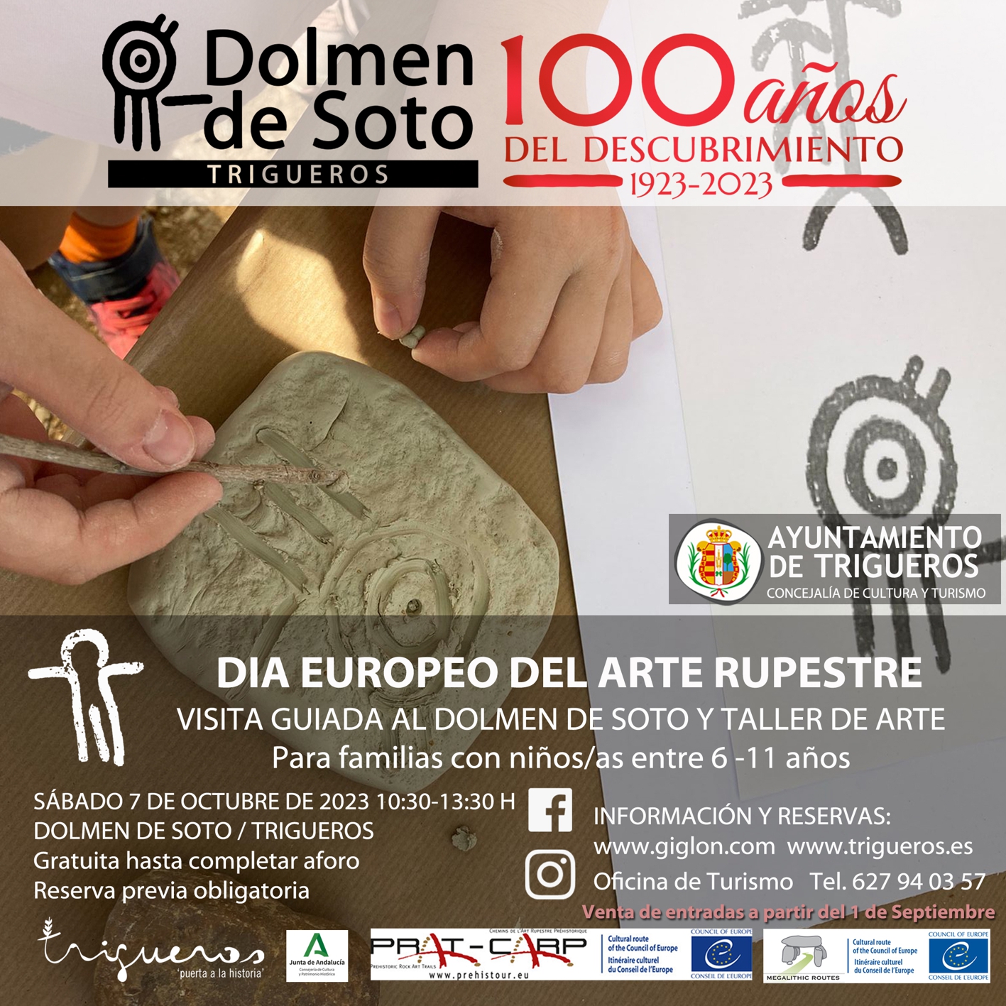 Visita guiada al monumento y taller de arte rupestre. Se desarrollará en la jornada del 7 de octubre, sábado. La actividad está especialmente dirigida a familias con niños/as de entre 6-11 años, e incluye un divertido taller de fabricación de grabados rupestres similares a los conservados en el interior del dolmen y una visita muy especial al Dolmen de Soto.