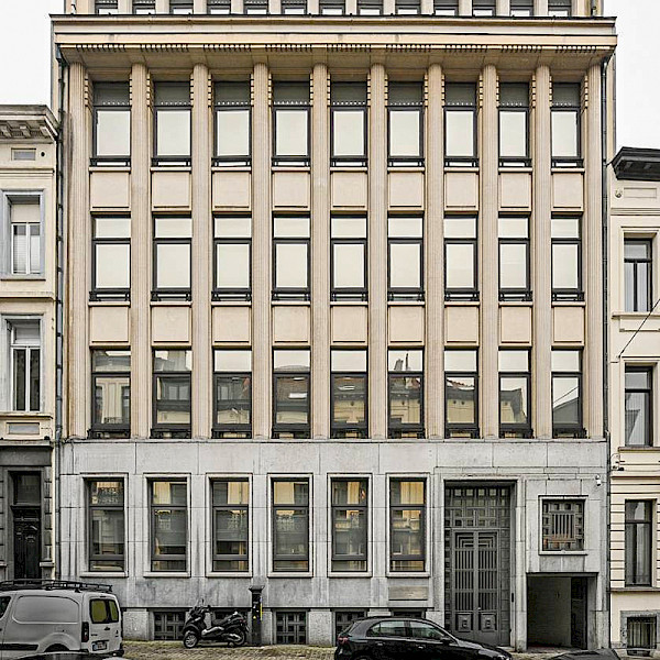 At the request of the Empain Group, architect Antoine Courtens drew up plans for a new building to house Electrorail’s headquarters. A pupil of Victor Horta, he had already designed the Palais de la Folle Chanson, as well as the Hôtel Haerens, which was under construction when work began on Rue de l’Association, two fine examples of the Art Deco style in Brussels. He naturally turned to his architectural background to design the facade, whose ground floor of small granite is pierced by six high bays with bush-hammered stone frames. It supports three storeys of white stone, punctuated by ten colossal engaged columns whose fluting emphasises the building’s vertical momentum; the whole is crowned by a projecting cornice topped by an attic with thirteen bays, each pierced by a window. One opening, over the garage door, and the front entrance, have retained their hammered wrought-iron decoration, typical of Art Deco. Formerly occupied by the European Bank for Latin America, the building now houses a law firm. In collaboration with Klare Lijn. Photographs are not permitted.