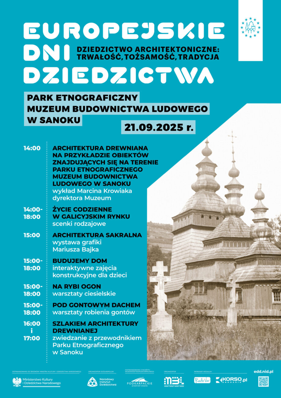 „Dziedzictwo Architektoniczne – trwałość, tożsamość, tradycja” – to wyjątkowe wydarzenie organizowane w sanockim skansenie, które przeniesie uczestników w świat dawnych mistrzów ciesielstwa i piękna drewnianych konstrukcji. Podczas spotkania odkryjemy piękno i bogactwo tradycyjnej architektury drewnianej – trwałego elementu naszej tożsamości i kulturowego dziedzictwa. W programie wykład, scenki rodzajowe „Życie codzienne na Galicyjskim Rynku”, wystawa grafiki Mariusza Bajka, warsztaty tematyczne, zwiedzanie „Szlakiem architektury drewnianej”. Serdecznie zapraszamy całe rodziny, pasjonatów architektury, miłośników tradycji i wszystkich, którzy chcą poczuć klimat dziedzictwa zaklętego w drewnie.