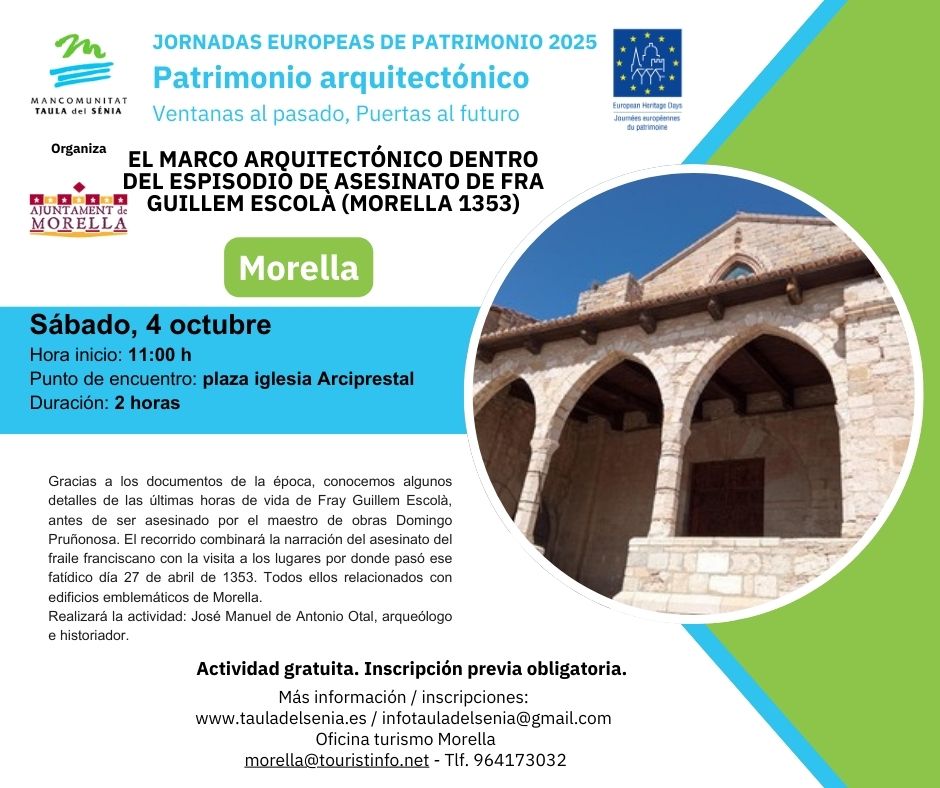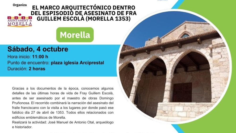 Gracias a los documentos de la época, conocemos algunos detalles de las últimas horas de vida de Fray Guillem Escolà, antes de ser asesinado por el maestro de obras Domingo Pruñonosa. El recorrido combinará la narración del asesinato del fraile franciscano con la visita a los lugares por donde pasó ese fatídico día 27 de abril de 1353. Todos ellos relacionados con edificios emblemáticos de Morella.