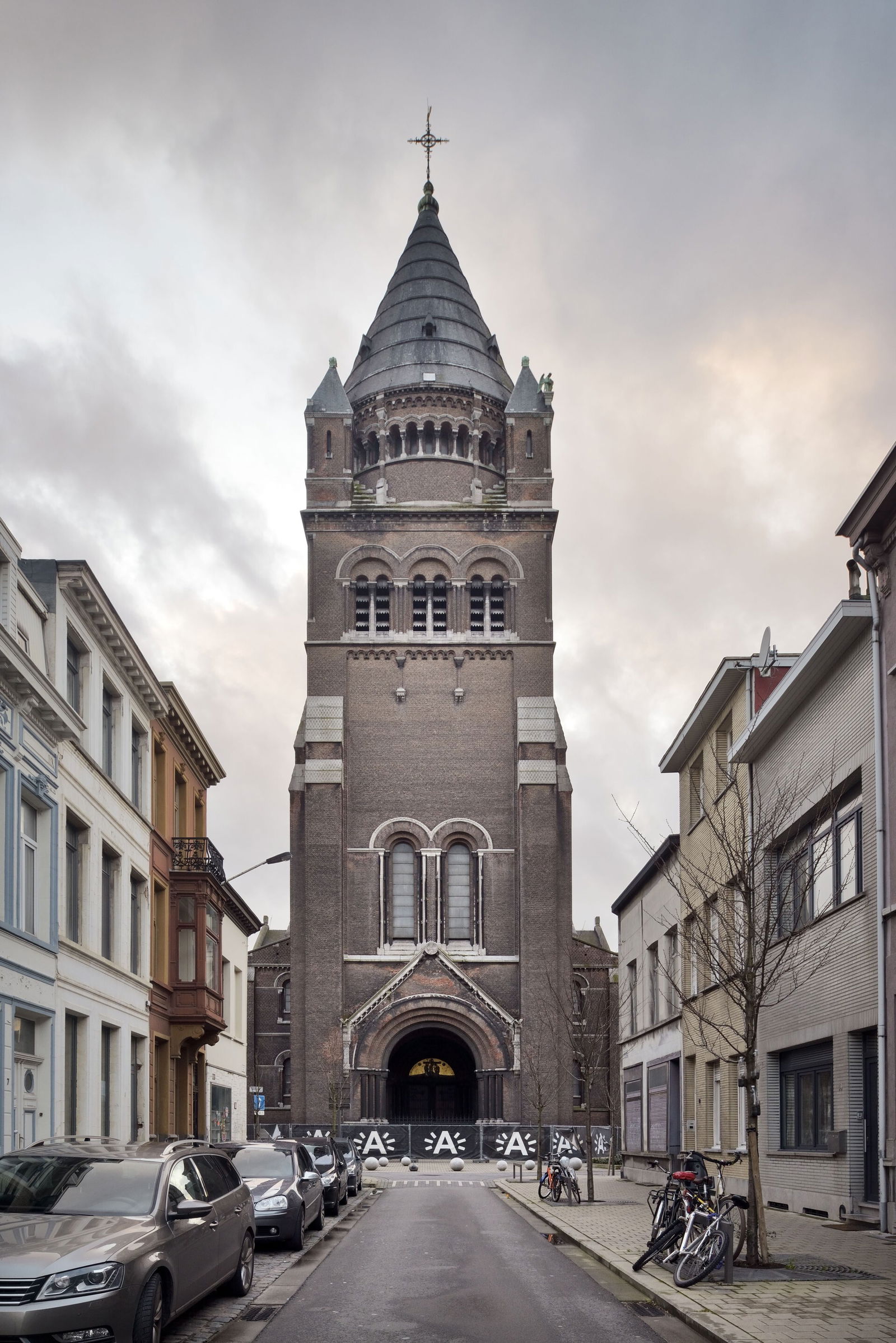 De kerk is volledig opgetrokken in neoromaanse stijl, zowel binnen als buiten (1887-1890). De belangrijkste karakteristiek van het gebouw is de robuuste, vierkante toren met kegelvormige spits, waaraan de kerk haar bijnaam ‘de Peperbus’ dankt. De toren is tot ver buiten Borgerhout zichtbaar en is een duidelijk herkenningspunt. In 2018 werd de kerk ontwijd. De kerk wordt momenteel gerestaureerd en klaargemaakt voor een nieuwe toekomst. Meer informatie vind je hier.