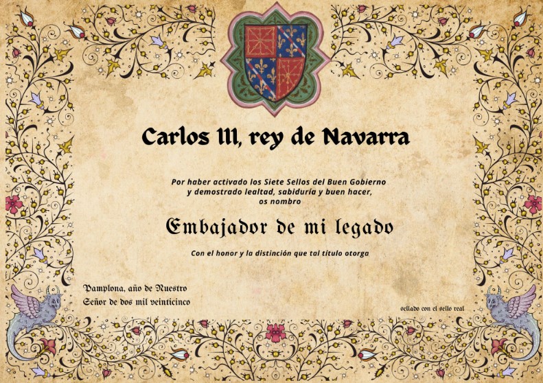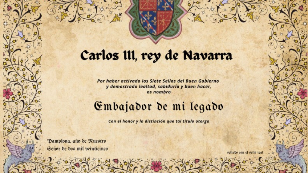 Vas a vivir una aventura guiada por un relato fantástico narrado por Tea en la azotea. A través de preguntas, pistas y pruebas sobre la exposición del archivo, conseguirás los 7 Sellos del Buen Gobierno de Carlos III el Noble. Si ganas todos ellos obtendrás el diploma de Embajador del legado del rey.