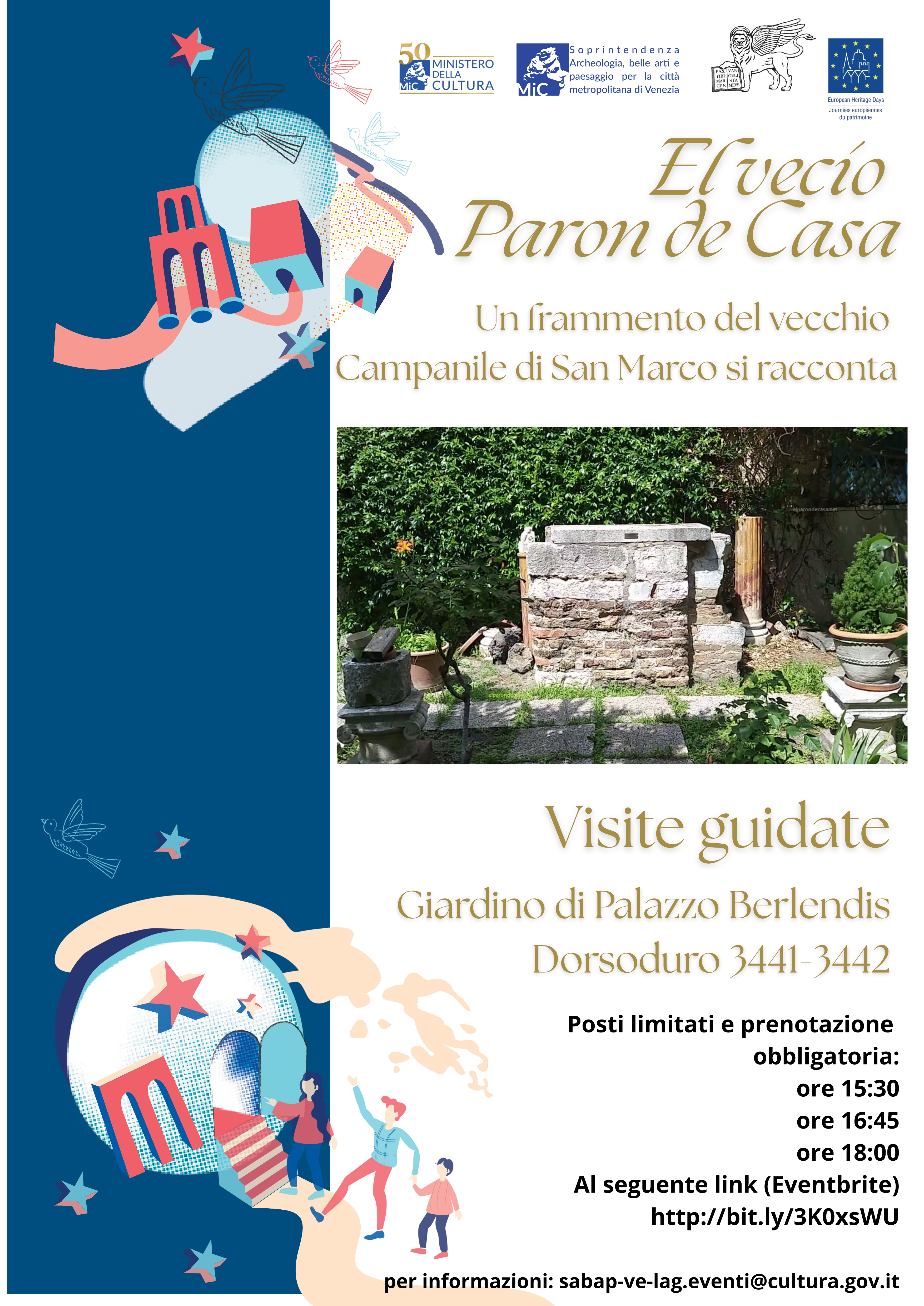 "El vecio paron de casa": un frammento del vecchio campanile di San Marco si racconta Visita guidata ad un frammento del vecchio campanile di San Marco crollato nel 1902, normalmente non visibile al pubblico A cura di Sara Bini - Giardino di Palazzo Berlendis, Dorsoduro ‐ turni di visita: ore 15:30, 16:45 e 18:00 Posti limitati e prenotazione obbligatoria: ore 15:30 ore 16:45 ore 18:00 Al seguente link (Eventbrite) http://bit.ly/3K0xsWU © 2021 MiC - Pubblicato il 2025-09-19 11:46:23 / Ultimo aggiornamento 2025-09-19 12:45:04