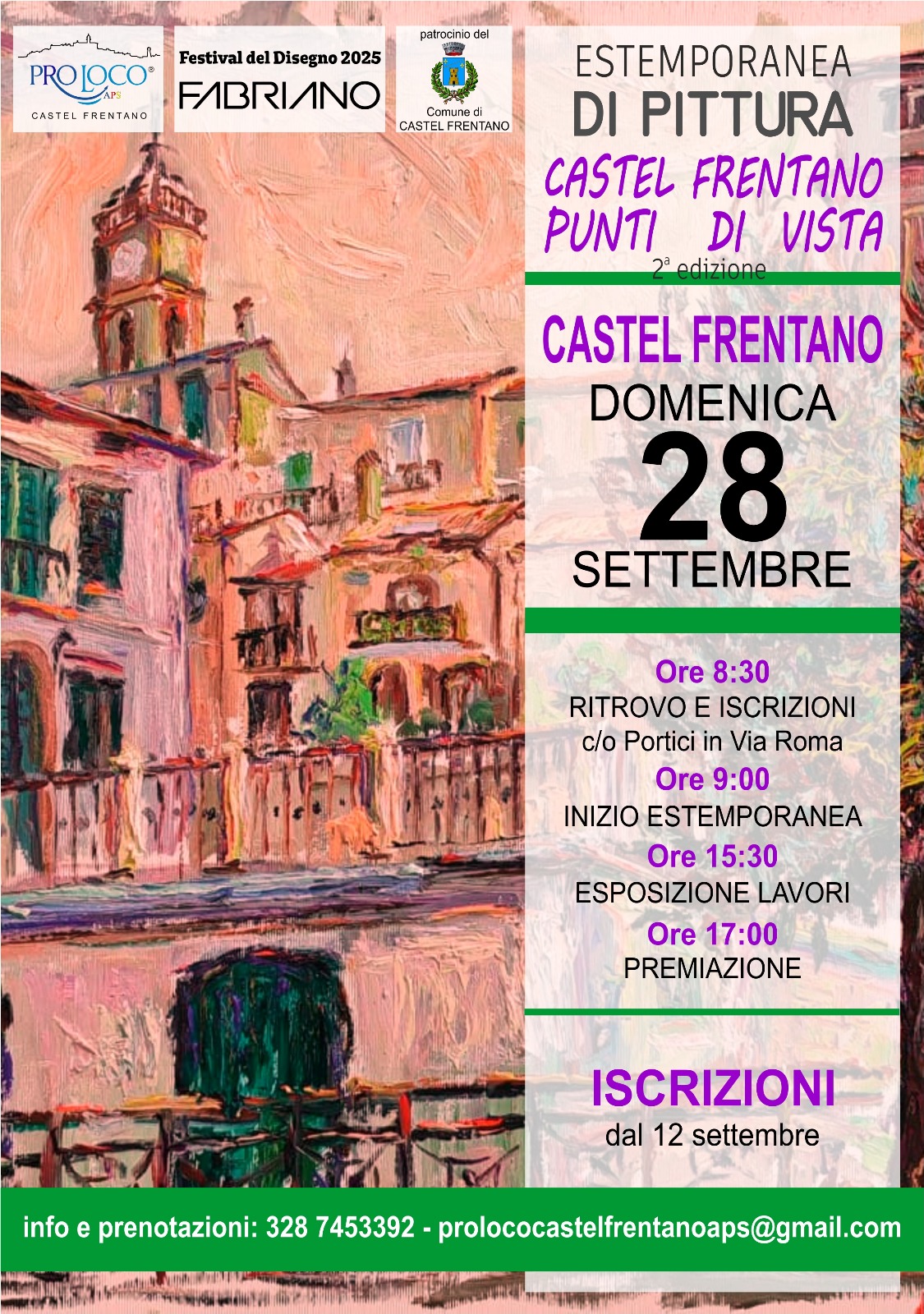 Giornate Europee del Patrimonio 2025 28 Settembre 2025 - ore 8:00-18:30 Castel Frentano La Pro Loco Castel Frentano, associazione di promozione culturale iscritta al RUNTS, ha in programma un'estemporanea di pittura aperta a tutti, che si svolgerà nelle strade principali del centro di Castel Frentano, al fine di promuovere e valorizzare l'inestimabile patrimonio castellino. Le vie interessate dall'evento sono sedi di infrastrutture e palazzi storici, come i portici comunali, il palazzo dei Marchesi Crognale (sito in piazza G. Crognale, la cui costruzione risale alla fine del XVIII sec), Palazzo Vergilj (XVII sec, sede baronale), Palazzo Cialente, la Chiesa del Santissimo Rosario (costruita nel settecento e decorata nel 1824 da Giuliano Crognale, pittore per diletto e autore di diverse opere in chiese del territorio frentano) e la Chiesa di Santo Stefano Protomartire (ricostruita nel 700 in stile neoclassico). © 2021 MiC - Pubblicato il 2025-09-11 13:21:55 / Ultimo aggiornamento 2025-09-16 12:34:45