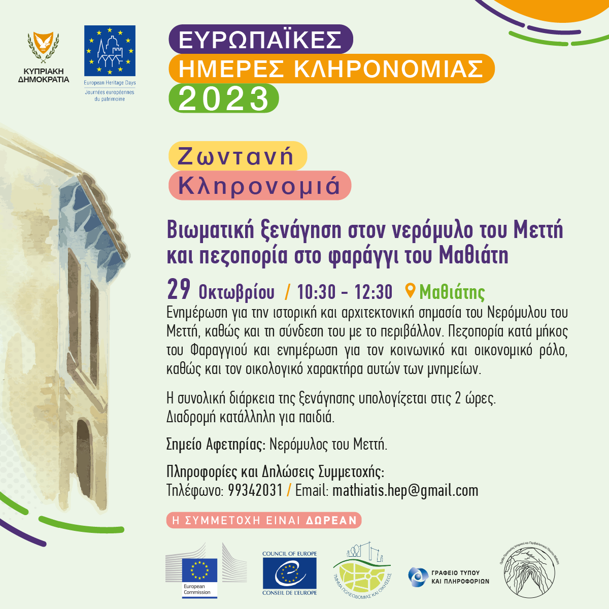 This event is organized by the Matiatis Historical and Environmental Heritage Protection Group, with the support of the Department of Urban Planning and Housing, the national coordinator of the program, in celebration of the European Heritage Days 2023.
