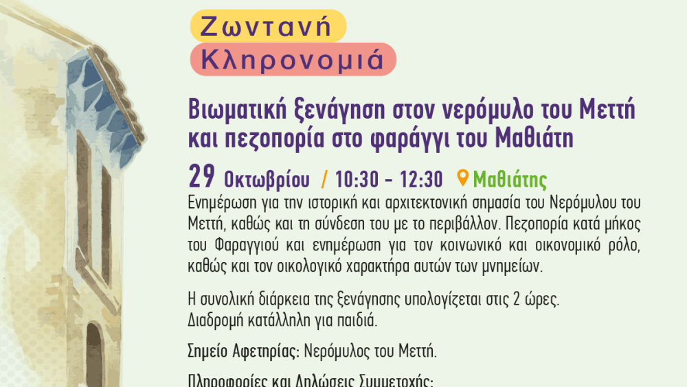We invite you to join us for an experiential guided tour at the Watermill of Metti and a hike in the Matiatis Gorge, scheduled for October 29, 2023, from 10:30 a.m. to 12:30 p.m.