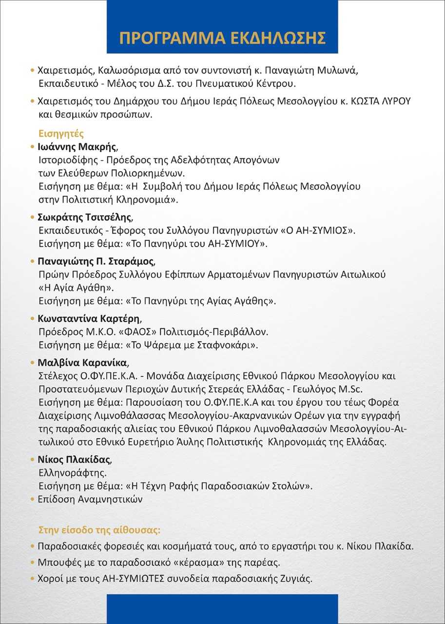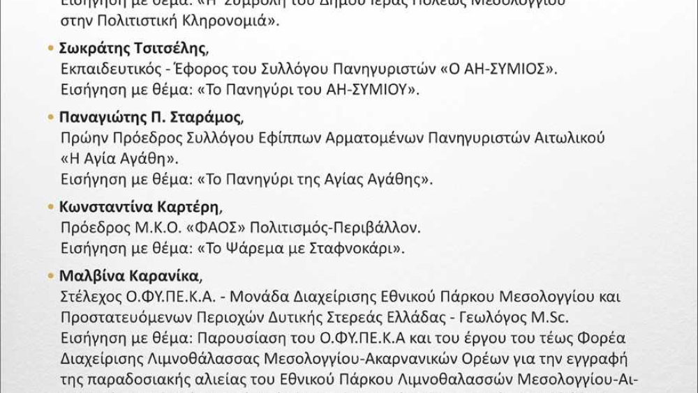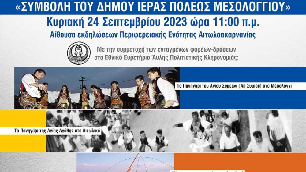 Εκδήλωση με τη συμμετοχή φορέων που έχουν εγγράψει στοιχεία στο Εθνικό Ευρετήριο Άυλης Πολιτιστικής Κληρονομιάς και υπάγονται στο Δήμο Ιεράς Πόλεως Μεσολογγίου- Ομιλίες για τις δράσεις τους σχετικά με την πολιτιστική κληρονομιά και παράδοση.