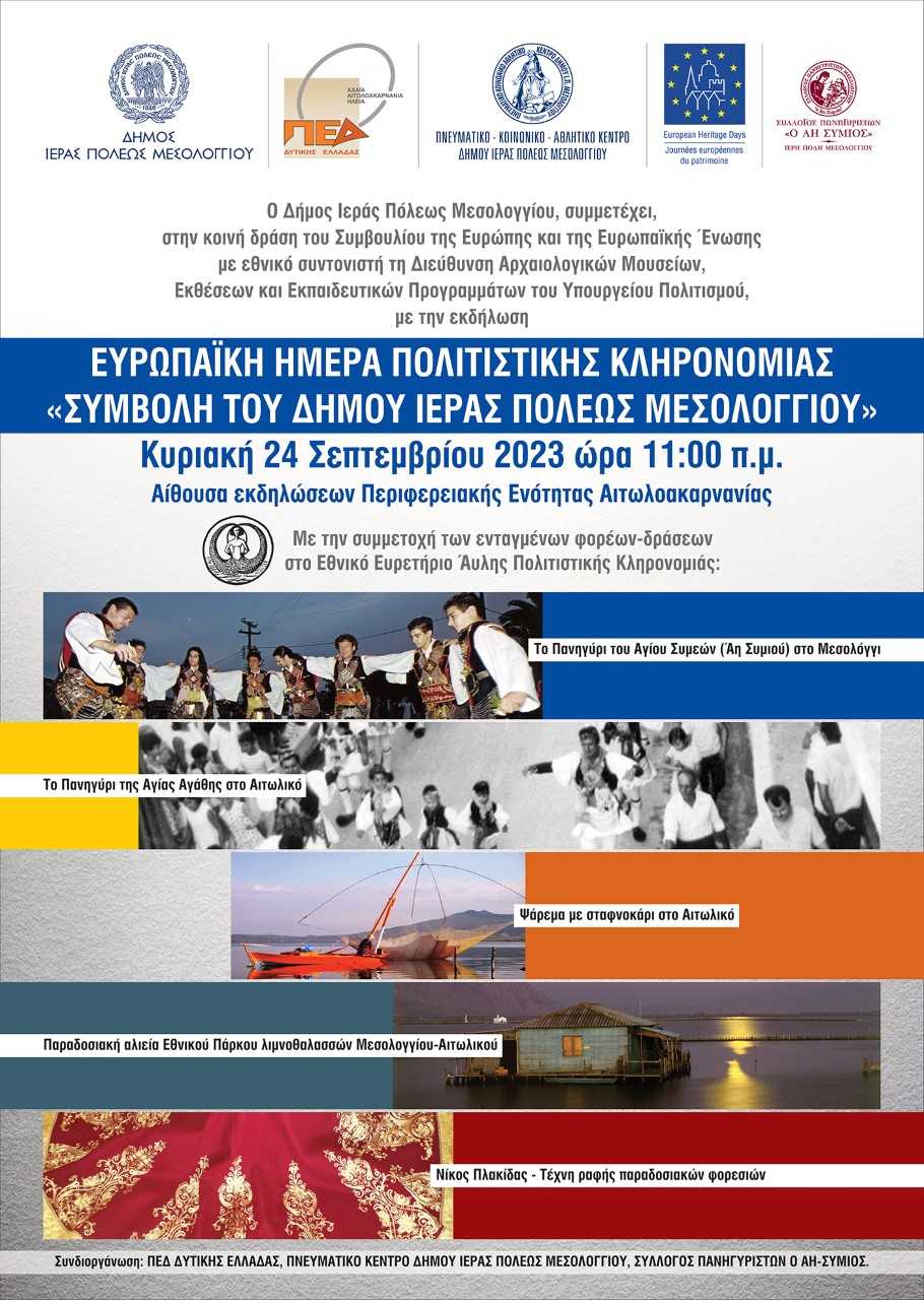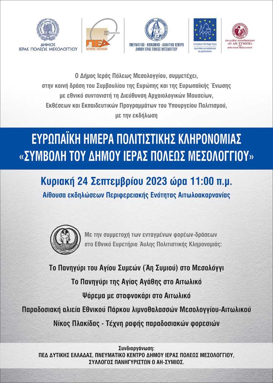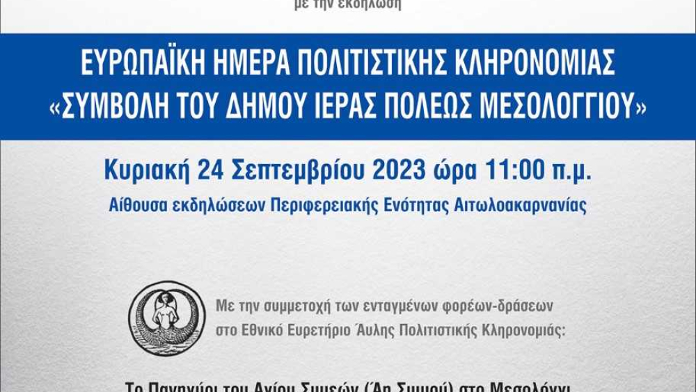 «Ευρωπαϊκή Ημέρα Πολιτιστικής Κληρονομιάς “Συμβολή του Δήμου Ιεράς Πόλης Μεσολογγίου”» στην αίθουσα εκδηλώσεων και τον αύλειο χώρο του κτηρίου της Περιφερειακής Ενότητας Αιτωλοακαρνανίας