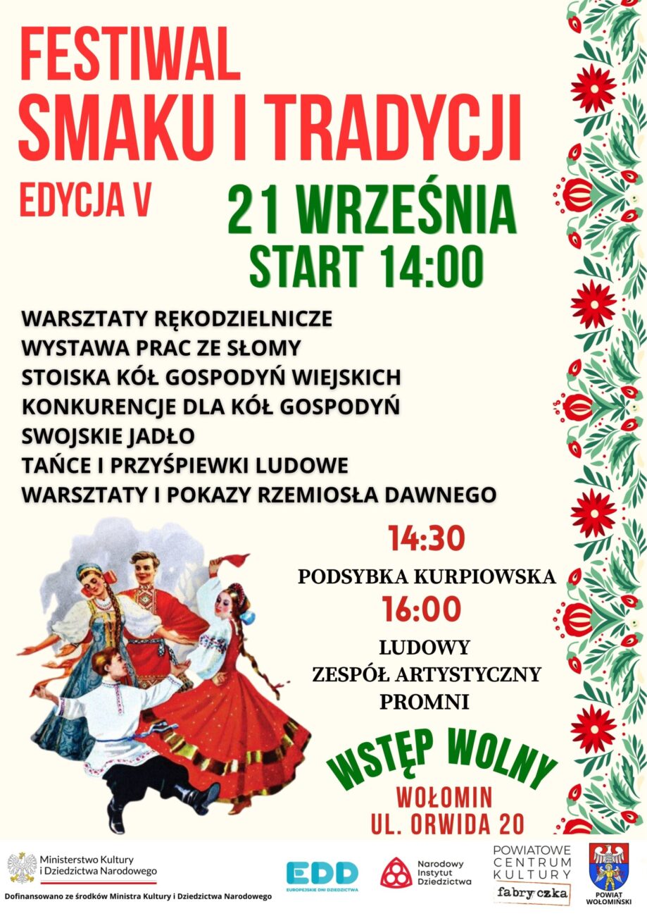 Na scenie plenerowej KONCERT Zespołu Promni i Podsybka Kurpiowska. Ponadto konkursy z nagrodami dla Kół Gospodyń, stoiska regionalne ze swojskim jadłem i rękodziełem a także warsztaty rzemiosła ludowego i tańca dawnego. Przyśpiewki, tańce i biesiada. Ma on na celu aktywizację mieszkańców powiatu wołomińskiego do czynnego i wspólnego udziału w kulturze oraz budowaniu własnej tożsamości jak i wyrażaniu szacunku i tolerancji do polskiej tradycji. Warto pielęgnować i chronić od zapomnienia wieloaspektowe dziedzictwo narodowe. Celem festiwalu jest integracja międzypokoleniowa uczestników, rozbudzenie chęci poznawania historii regionów Polski i dawnych tradycji. Projekt ma charakter niekomercyjny.