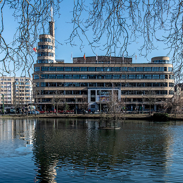 In 1933, Joseph Diongre won the competition to design the new home of the National Institute of Radio Broadcasting. He worked with different engineers to meet the technical requirements of the future buildings. One of them, Raymond Braillard, was responsible for the large corner turret. The modernist-style building was also inspired by the International style in vogue in the Netherlands at the time, while its Streamline Moderne silhouette and interior decor are tacitly reminiscent of Art Deco. Diongre, who blended bluestone with Foucquemberg yellow-ochre sandstone brick, endowed each floor with continuous glazing in the entablature, thus endorsing its horizontal approach. He designed rounded corners to soften the building’s imposing appearance. Work began in 1933 and was completed in 1938. The seven-storey building on the Place Flagey side, with six storeys on the Place Sainte-Croix side, had a powerful foundation of 836 concrete piles anchored into the ground. There are no fewer than twelve recording studios, including the famous Studio 4 with its 8,000-pipe organ. The astonishing acoustic qualities are complemented by the meticulous finish of a décor based on the extensive use of wood. The complex was put up for sale, and bought in 1998 by the limited company Maison de la Radio Flagey. It was fully restored. Today, Flagey is home to a unique audiovisual hub in Brussels, offering studios, concert halls, cinemas, offices and restaurants/bars. It proposes festivals and a rich programme of classical music, jazz and cinema. (CL 28/04/1994) In collaboration with Arkadia (FR) and Korei Guided Tours (NL/EN). Photographs are permitted, but only with smartphones.