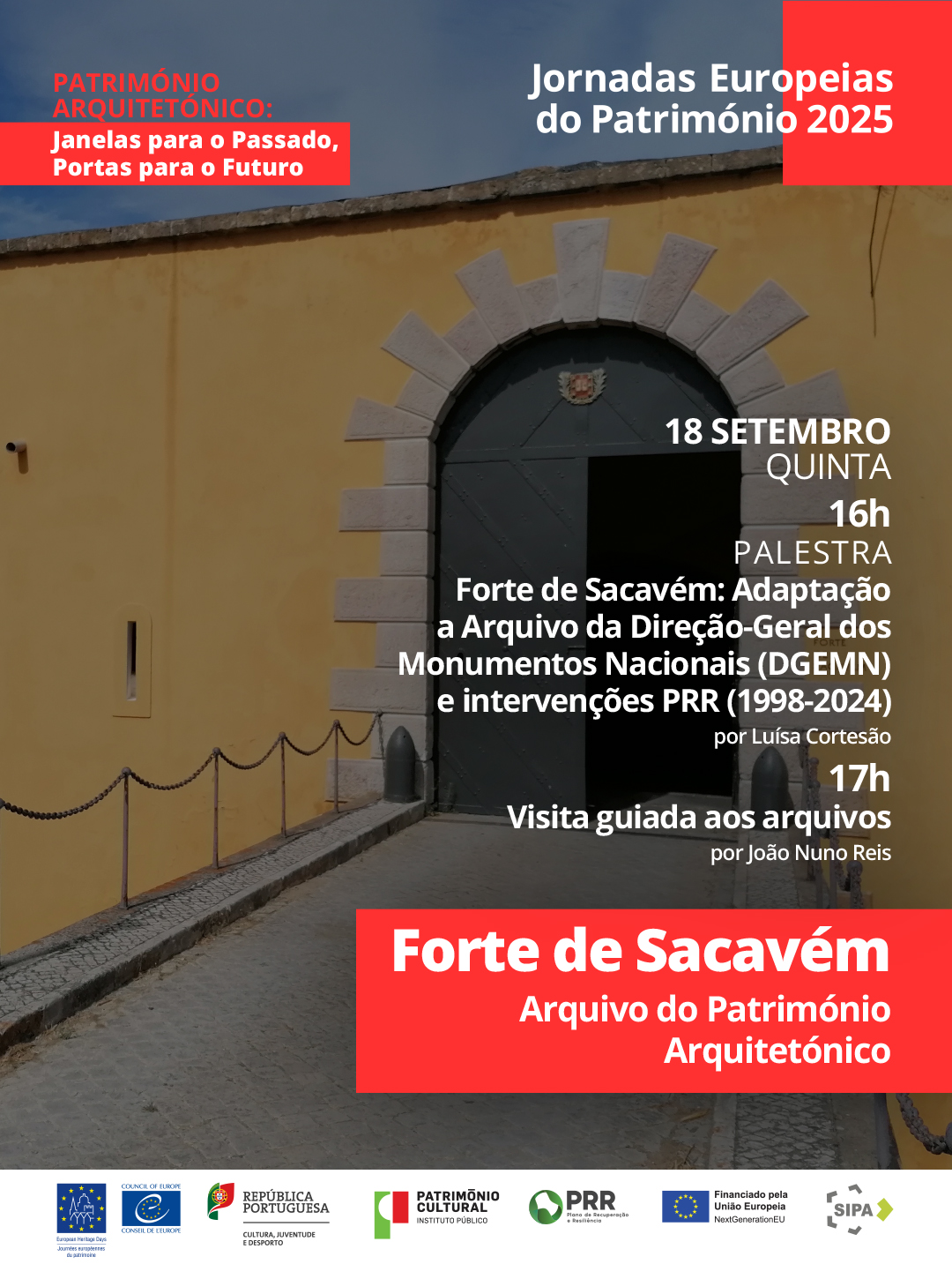 18-09-2025 Programa: 16h00: PALESTRA "Forte de Sacavém: adaptação a arquivo da Direção-Geral dos Monumentos Nacionais (DGEMN) e intervenções PRR (1998-2024)", Luísa Cortesão, Arq.ª O Forte de Sacavém é, de facto, uma instalação complexa a vários títulos: desde logo pela especificidade da arquitetura, passando, depois, pelo valor histórico documental que lhe é intrínseco e que cumpre preservar e valorizar, acabando na complexidade da infraestrutura tecnológica de suporte ao programa funcional arquivístico que lhe foi atribuído. A complexidade tecnológica atingiu a expressão máxima com a construção e ocupação do designado edifício “Arquivos II”, construído de raiz e também ele semienterrado (2007). As obras de adaptação do Forte a novas funções, sob a coordenação da Arquiteta Luísa Cortesão, duraram 10 anos (1997-2007, DGEMN). 17h00: VISITA GUIADA AOS ARQUIVOS, João Nuno Reis, Dr. As visitas constituem uma forma privilegiada de descobrir o Forte de Sacavém / Reduto do Monte Cintra, através de um circuito por alguns dos espaços do interior, onde se destacam as áreas de Tratamento Técnico Documental, incluindo Laboratório de Conservação Gráfica e Fotográfica, Gabinetes de Investigação e ainda, um percurso pelo espaço exterior envolvente. É assim possível conhecer de perto o funcionamento e a importância dos acervos aqui preservados bem como a história deste monumento.