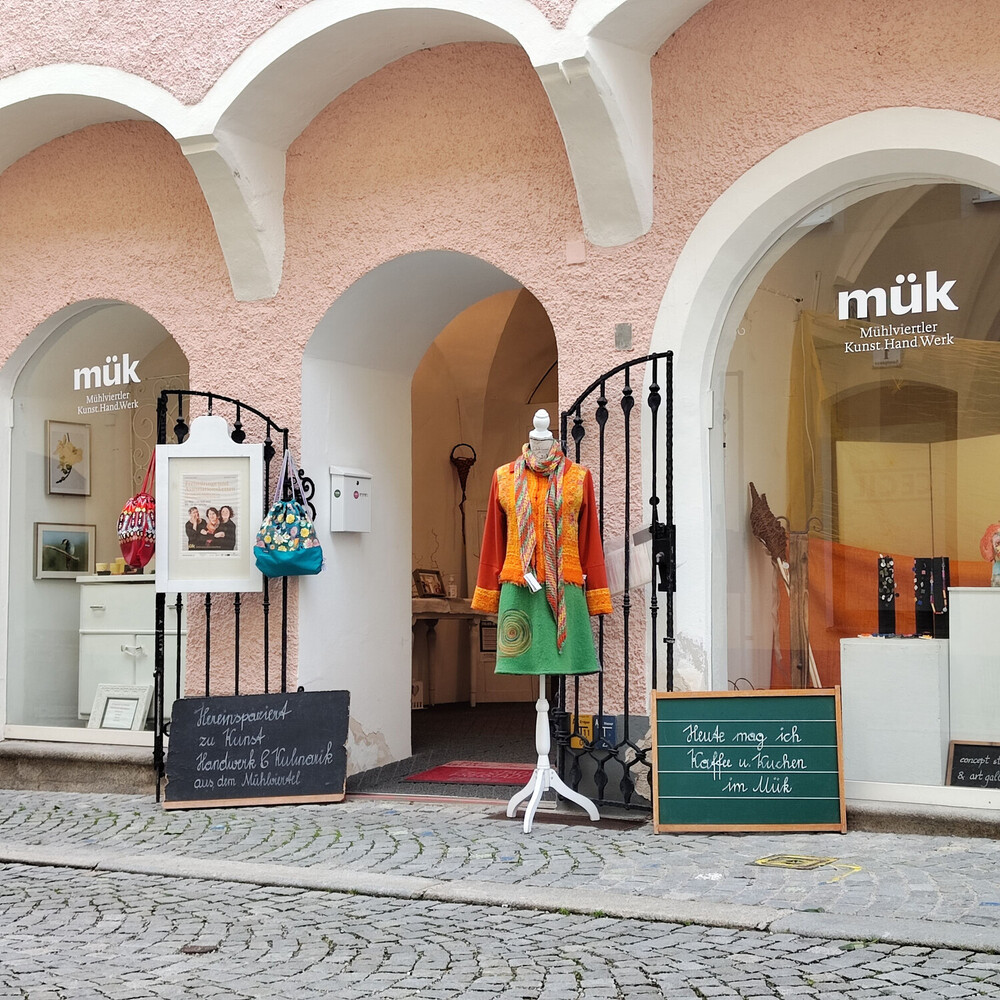 Das mük in Freistadt ist ein Altstadthaus mit drei Ebenen, auf denen Kunst, Handwerk und Kulinarik aus dem Mühlviertel erlebbar werden. Betrieben wird es von einem Verein mit rund 100 Mitgliedern. Obfrau Christa Oberfichtner gibt bei Führungen Einblick in das Gemeinschaftsprojekt und erzählt von den kreativen Menschen, die dahinter stehen. Dass auch das Haus selbst eine Besonderheit darstellt, zeigt ein Blick in die Historie der Adresse Samtgasse 4. Das spätgotische Gebäude aus der Zeit Ende 15. / Anfang 16. Jahrhundert steht seit 1971 unter Denkmalschutz. In der Vergangenheit wurde es immer wieder von Handwerker:innen bewohnt. 2016 wurde es vom Verein Mühlviertel Kreativ angemietet und seither als mük genutzt. Verkauf, Ausstellungen und Workshops bringen neues Leben in die alten Mauern und machen es möglich das Altstadthaus von unten bis oben zu besichtigen.