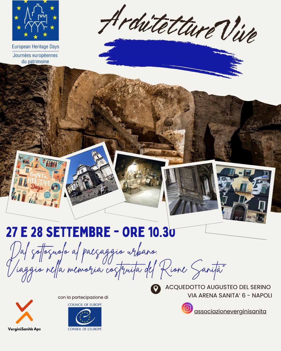 La passeggiata si inserisce nell'ambito delle Giornate Europee del Patrimonio 2025, in occasione del 50° anniversario dell'Anno Europeo del Patrimonio Architettonico. Il quartiere Sanità, situato nella Terza Municipalità di Napoli, rappresenta un laboratorio urbano in cui architettura, storia e comunità si intrecciano in modo unico.- Acquedotto Augusteo del Serino – Via Arena alla Sanità. Infrastrutture antiche, ingegneria romana, riscoperta e valorizzazione contemporanea. Un viaggio nel ventre della città. Come l’acqua plasmava le città romane, così oggi la memoria può irrigare il futuro.