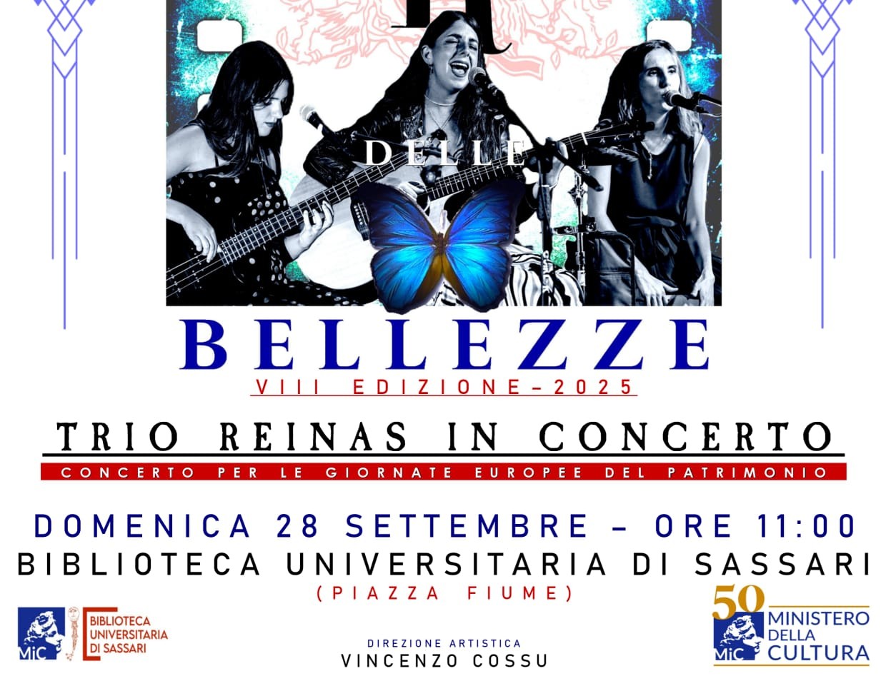 GEP 2025 BUSS - Trio Reinas in concerto Domenica 28 settembre ore 11.00 - Cappella dell'ex Ospedale Civile SS Annunziata La Biblioteca, in collaborazione con il Festival Bellezze alla sua VIII edizione, ospita con la direzione di Vincenzo Cossu, il concerto in acustico del Trio Reinas Il Trio Reinas è un gruppo femminile sardo, nato come tributo acustico ai Queen di Freddy Mercury, Brian May, Roger Taylor e John Deacon. La musica del Trio nasce e si sviluppa rielaborando i brani dei Queen con arrangiamenti acustici originali, negli anni poi le ragazze hanno ampliato il repertorio includendo anche brani in lingua, spaziando nella musica tradizionale sarda. Il trio nasce nel 2022 da un'idea di Vincenzo Cossu, che mette insieme le tre talentuose musiciste formatesi nel modo delle corali ed è composto da Valeria Secchi (voce principale e chitarra acustica), Aurora Cossu (percussioni e seconde voci) e Viola Tanca (basso e seconde voci). © 2021 MiC - Pubblicato il 2025-09-16 17:27:54 / Ultimo aggiornamento 2025-09-17 13:10:02