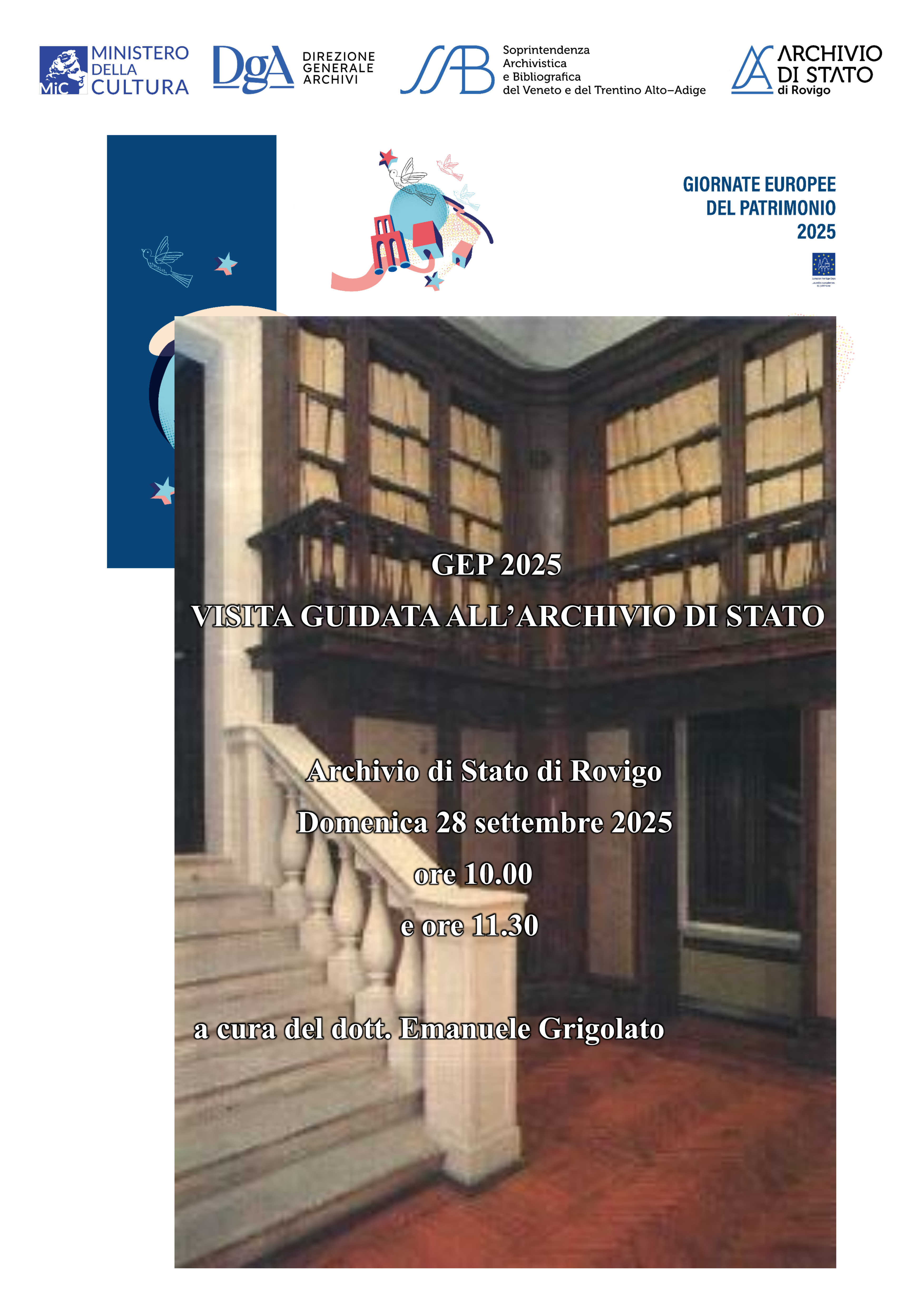GEP 2025 VISITA GUIDATA ALL’ARCHIVIO DI STATO Archivio di Stato di Rovigo Domenica 28 settembre 2025 ore 10.00 e ore 11.30 a cura del dott. Emanuele Grigolato © 2021 MiC - Pubblicato il 2025-09-19 11:20:27 / Ultimo aggiornamento 2025-09-22 10:00:26