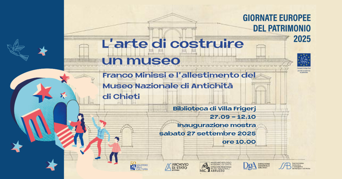 📍 Biblioteca di Villa Frigerj – Museo Archeologico Nazionale d’Abruzzo, Chieti 📅 Dal 27 settembre al 12 ottobre 2025 La mostra “L’arte di costruire un museo. Franco Minissi e l’allestimento del Museo Nazionale di antichità in Chieti” presenterà i progetti museografici elaborati da Minissi per il museo teatino. Attraverso documenti provenienti dall’Archivio di Stato di Chieti, materiali inediti del Fondo Minissi dell’Archivio Centrale dello Stato, fotografie e testimonianze, il percorso espositivo ricostruirà la genesi del Museo, i principi progettuali adottati e il contesto culturale dell’epoca. Un’occasione unica per conoscere da vicino l’approccio museografico di Minissi e riscoprire l’evoluzione del Museo Archeologico Nazionale d’Abruzzo, con particolare attenzione al ruolo determinante di Cianfarani. 👉 L’accesso alla mostra è incluso nel biglietto del Museo.Un’iniziativa per le Giornate Europee del Patrimonio
