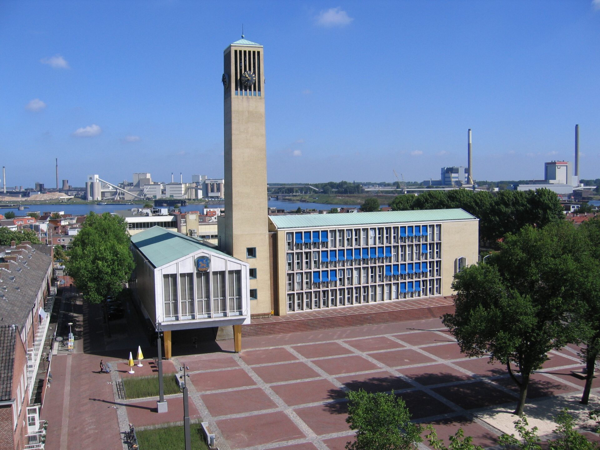 In 1949 gaf de gemeente Velsen architect W.M. Dudok de opdracht een nieuw stadhuis te ontwerpen. Het raadhuis in Oud-Velsen bleek te klein voor de snel groeiende gemeente. Het nieuwe gebouw moest uitgroeien tot het pronkstuk van het wederopbouwplan voor IJmuiden, dat tijdens de Tweede Wereldoorlog zwaar was getroffen. De gemeente keurde het ontwerp pas in 1962 goed en startte datzelfde jaar met de bouw. Dudok ontwierp een modern en representatief gebouw rond een binnenhof. Hij plaatste de raadzaal ver naar voren om de macht van het bestuur te benadrukken. Voor de toren en de binnenplaats liet hij zich inspireren door klassieke Italiaanse voorbeelden, waardoor het pand een indrukwekkende maar sobere uitstraling kreeg. Met zijn ontwerp wist Dudok zakelijkheid en representatie te verenigen. Het stadhuis staat nog altijd als een krachtig voorbeeld van naoorlogse monumentale architectuur.