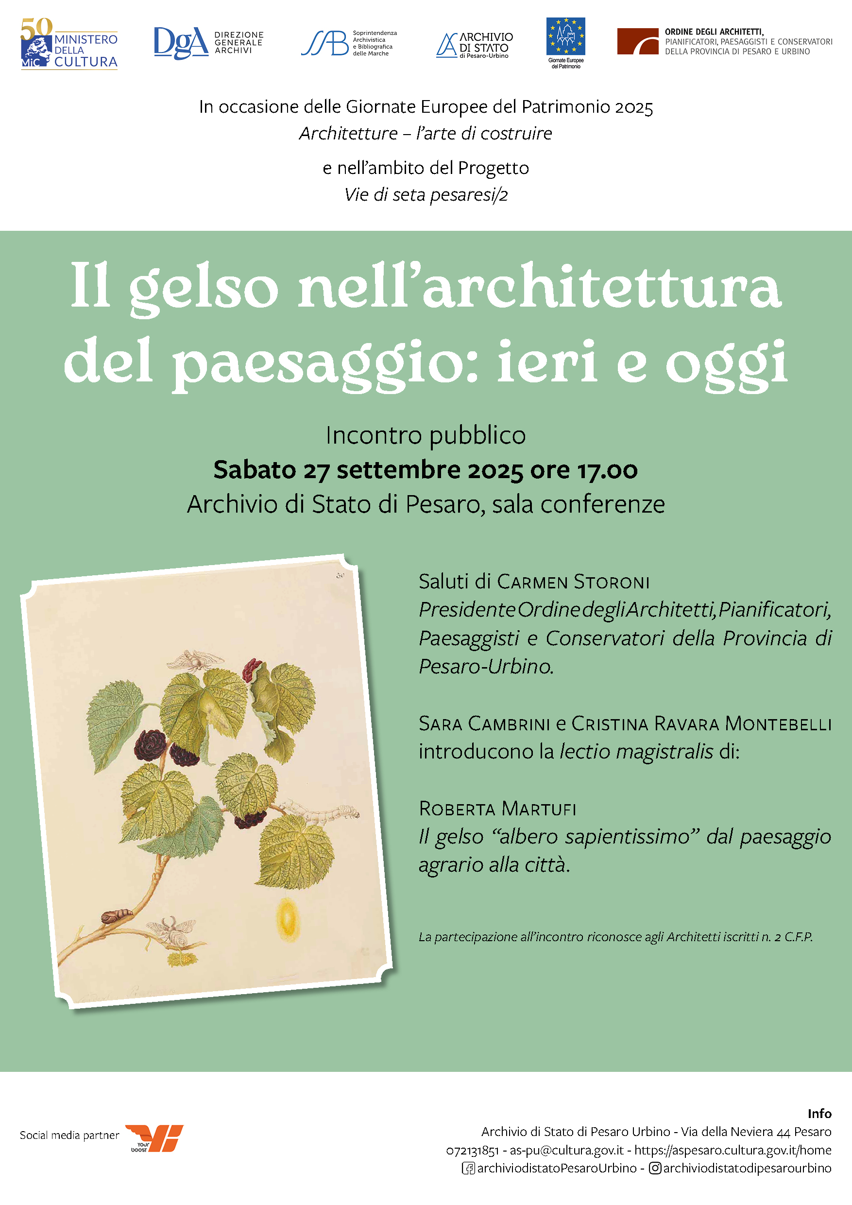 In occasione delle Giornate Europee del Patrimonio 2025, il cui tema quest’anno è Architectural Heritage: Windows to the Past, Doors to the Future, declinato in Italia come “Architetture: l’arte di costruire”, sabato 27 settembre, alle ore 17, presso l'Archivio di Stato di Pesaro, Sara Cambrini e Cristina Ravara Montebelli introducono la lectio magistralis di: Roberta Martufi Il gelso “albero sapientissimo” dal paesaggio agrario alla città con i saluti di Carmen Storoni Presidente dell'Ordine degli Architetti, Pianificatori, Paesaggisti e Conservatori della Provincia di Pesaro-Urbino. Con il patrocino dell'Ordine degli Architetti, Pianificatori, Paesaggisti e Conservatori della Provincia di Pesaro-Urbino. La partecipazione all’incontro riconosce agli Architetti iscritti n. 2 C.F.P. © 2021 MiC - Pubblicato il 2025-09-18 15:41:18 / Ultimo aggiornamento 2025-09-19 11:37:34