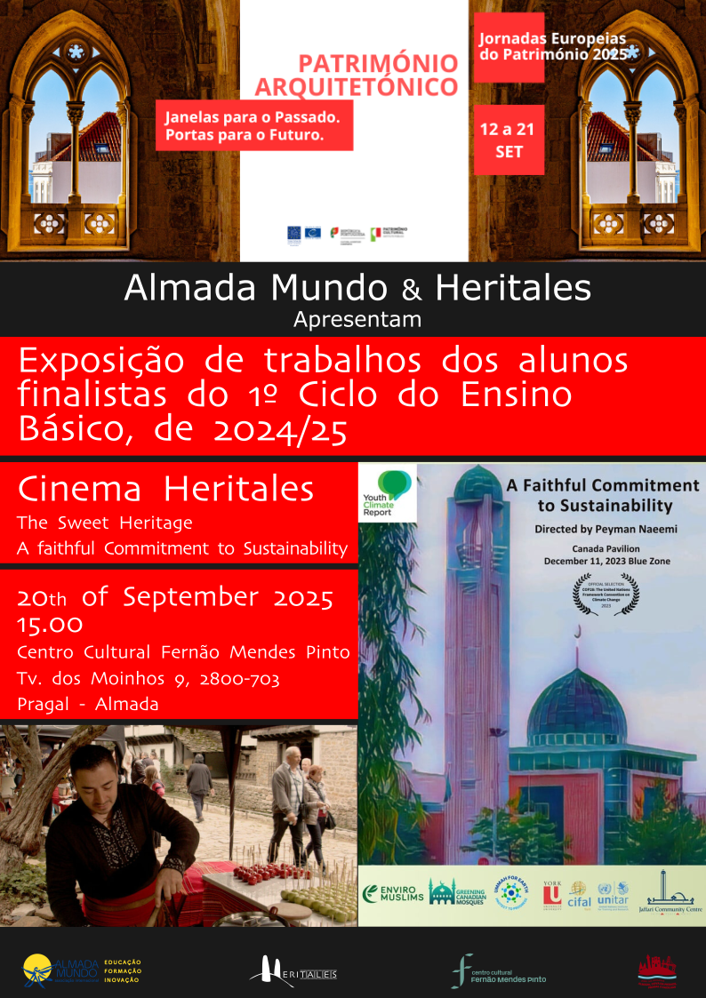 Heritales Programa Escolar “Aprendo a Ser Futuro” Almada Mundo Associação Internacional de Educação, Formação e Inovação, convida a visitar a Exposição de trabalhos dos alunos finalistas do 1º Ciclo do Ensino Básico, de 2024 – 2025. Os alunos das Escolas da União de Freguesias de Almada, Cova da Piedade, Pragal e Cacilhas partilham aprendizagens significativas, nas áreas de cidadania, multimédia, fotografia, vídeo, psicologia, filosofia, desenvolvimento pessoal e educação estética e artística. Para a ocasião, o Heritales - Festival Internacional Do Cinema Do Ptrimonio, escolheu dois documentários incríveis sobre tradições, sustentabilidade e construção comunitária. O primeiro será "The Sweet Heritage" by Vanya Boycheva, que conta a história de Boyan, um pasteleiro de terceira geração cujas maçãs doces e galos atraem visitantes jovens e idosos que vêm deliciar-se nas ruelas de paralelepípedos do Museu. O segundo "A faithful commitment to sustainability" by Payeman Naeemi, adota uma abordagem baseada na fé para a sustentabilidade numa comunidade muçulmana em Vaughan, Ontário. Juntos pelo Património! Participa! Terás uma boa surpresa! Local: Centro Cultural Fernão Mendes Pinto - Tv. dos Moinhos 9, 2800-703 Pragal, Almada Inauguração: 15 H dia 20 de setembro de 2025