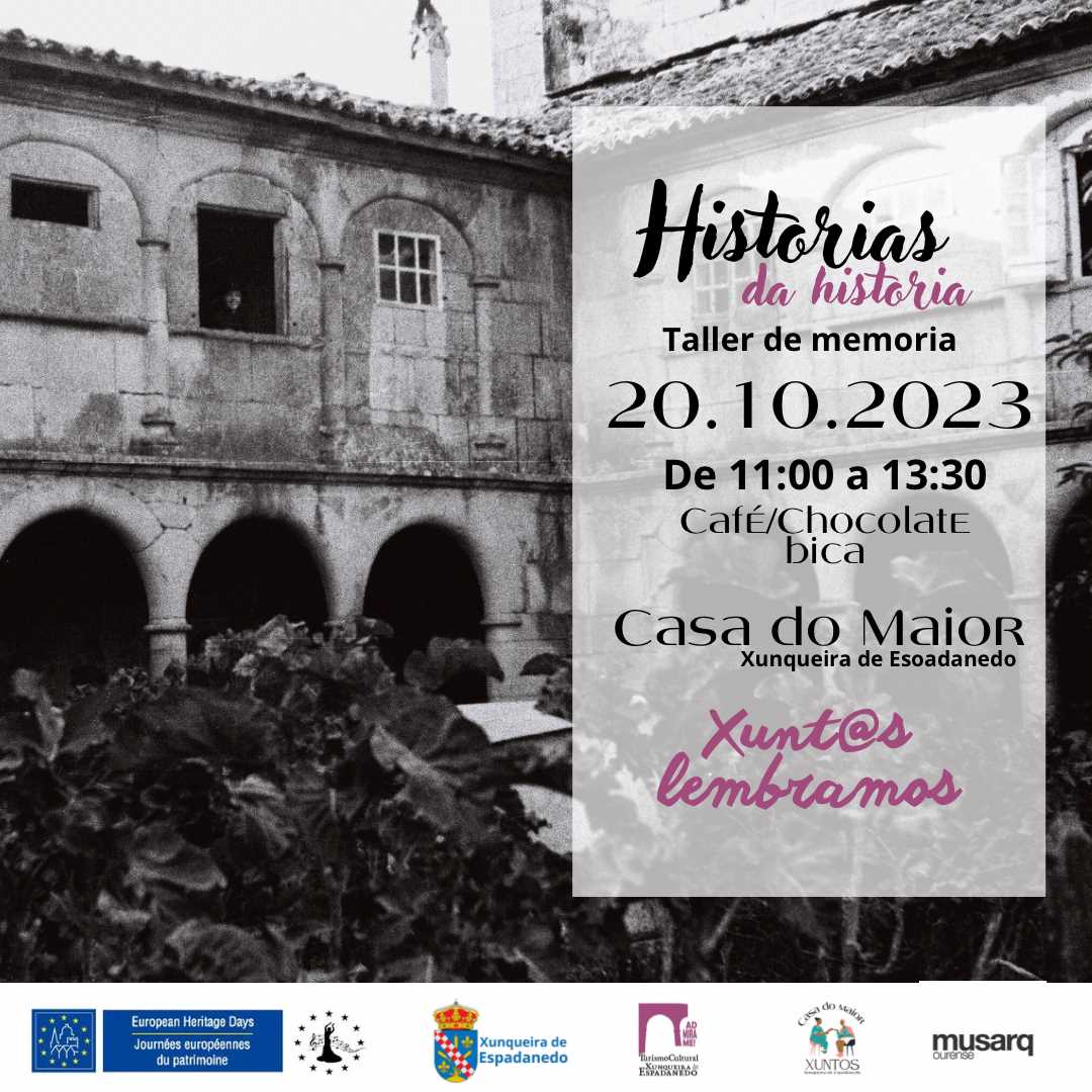 Taller de memoria en torno al Monasterio Cisterciense de Santa María de Xunqueira de Espadanedo. 100 años de cambios que descubriremos de la mano de 50 instantáneas (1920-1970) ayudados por la menoría de quienes vivieron la Historia del monasterio; los/as mayores de la parroquia, a través de sus historias nos ayudaran a entender la Historia mas reciente de nuestro mayor signo de identidad: el monasterio de Santa María de Xunqueira de Espadanedo