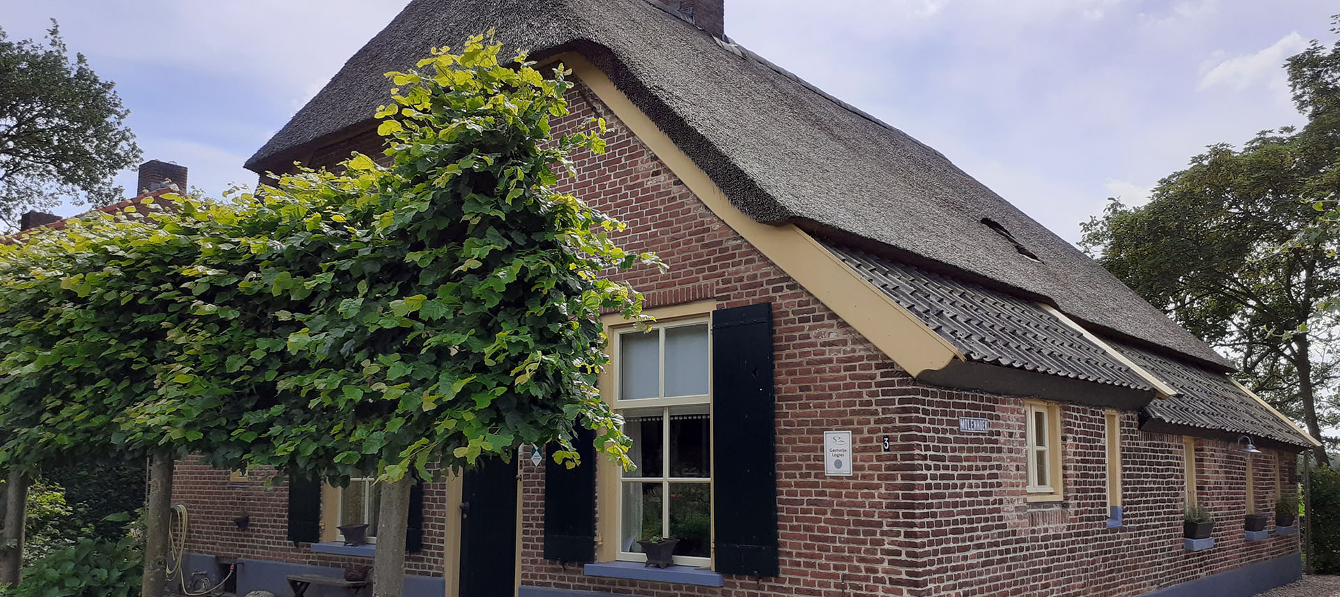 Uit bouwsporen in de voorgevel blijkt dat in deze gevel oorspronkelijk wellicht schuurdeuren hebben gezeten waaruit geconcludeerd kan worden dat het gebouw oorspronkelijk gebouwd was als schuur en later verbouwd werd tot woning. De opzet van het huidige woongedeelte aan de voorzijde van het pand dateert uit de late negentiende- of vroege twintigste eeuw. Van 1960 tot 1994 was het pand in gebruik als schuur. In 1994 werd de schuur weer als woning in gebruik genomen. Deze kleine boerderij van het hallehuistype is met de korte voorgevel aan de straat gebouwd is opgetrokken op een rechthoekige plattegrond. Het bezit een zadeldak met wolfseinden boven de voor- en achtergevel. Aan de westzijde (rechter zijgevel) is het gevelwerk van het woongedeelte iets hoger opgetrokken dan het gevelwerk van het voormalige bedrijfsgedeelte. Het dak is gedekt met riet met onderaan zes lagen Oudhollandse dakpannen. Op de nok, op de scheiding van het woongedeelte en het voormalige bedrijfsgedeelte, bevindt zich een uit de oude brandgevel oprijzende bakstenen schoorsteen. De gevels zijn opgetrokken in baksteen in kruisverband met een gepleisterde plint. In de voorgevel zijn links en rechts boven de voordeur de sporen (moeten) te zien die er wellicht op duiden dat hier voorheen een ingang naar de deel heeft gezeten. Het metselwerk onder deze moeten is van duidelijk latere datum. Een ingrijpende verbouwing van de ingangspartij behoort ook tot de mogelijkheden. De voorgevel bezit links in de gepleisterde plint een (oorspronkelijk) kelderraam (rechthoekig) met diefijzers in de opening, aan de bovenzijde gevat in een oude eiken bovendorpel. Rechts van de middenas bevindt zich de deuropening onder een rollaag. Deze deur wordt aan weerszijden geflankeerd door een venster onder een rollaag met in de opening een kozijn met luiken en een zes-ruits schuifraam. Links in de gevel bevindt zich boven het kelderlicht een smal opkamervenster met een twee-ruits schuifraam. Centraal in de topgevel bevindt zich een zoldervenster met een vier-ruits schuifraam. De kleine varkensschuur op het achtererf heeft de oorspronkelijke hoofdvorm met oude bakstenen gevels en houten geveltop behouden. De oorspronkelijke detaillering met een houten gevelschot, kenmerkend voor meerdere schuren in dit gebied, is nog aanwezig. Huis en schuur liggen op een oude rivierduin; de opa van de eigenaar teelde er vroeger nog tabak. In het pand wordt een bed & breakfast-voorziening geëxploiteerd onder de naam “t Behouden Huys Bed & Bôteram”. (www.bedenboteram.nl)