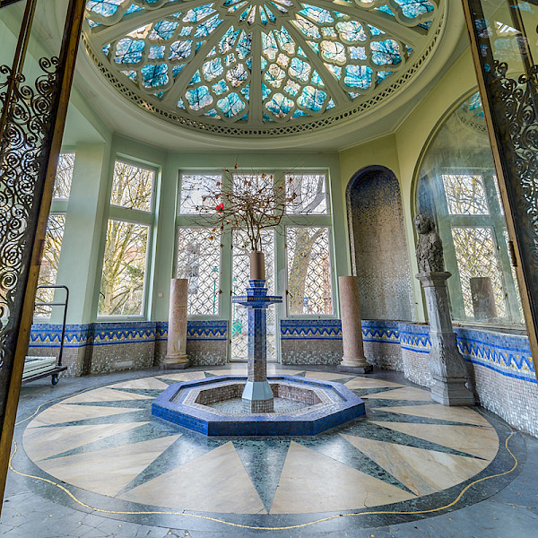 Attributed to architect Adolphe Pirenne, this eclectic-style mansion, which even includes stables, has a Flemish neo-Renaissance-inspired facade. Initially inhabited by the Colson family, it was sold to industrialist Eugène Pelgrims in 1927 before becoming municipal property in 1963. A lover of the arts, this well-educated pharmacist gave architect Fernand Petit the go-ahead for a complete overhaul of the complex in 1927. The interior reflects both Flemish Renaissance-inspired historicism in the living room and dining room, for example, and Art Deco influences in the washroom and winter garden. This garden retains an elegant openwork concrete structure adorned with bluish stained glass windows decorated with stars. Also in the Art Deco style are the upstairs bedrooms and bathrooms, which have retained their beige and black marble facings, built-in wardrobes and mirrors, and a beautiful set of stained glass windows. The main oak staircase dates from 1905. It is illuminated by pastel Art Deco stained glass windows featuring stylised plant motifs. Today, the ground and first floors of Maison Pelgrims are dedicated to the arts and creativity in all its forms: visual, musical and literary. Now a true "Maison des Artistes", the premises host a variety of exhibitions (painting, photography, sculpture), as well as small concerts and conferences. (CL 21/06/2001) In collaboration with Arkadia (FR) and Korei Guided Tours (NL/EN). With the support of the Service Culture de Saint-Gilles.