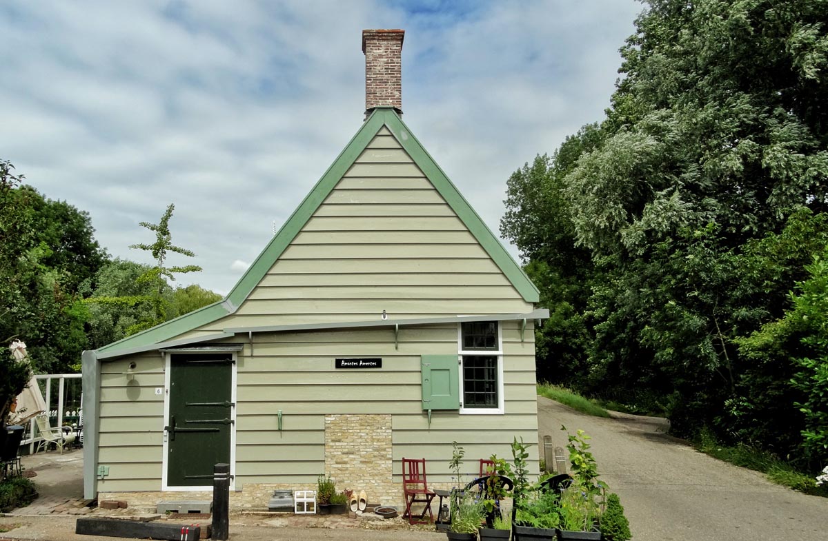 Kom binnenkijken in dit leuke houten huisje. Toen dit huisje, dat toen nog ’t Spul heette, te koop stond waren Frans en Janny op slag verliefd en besloten het te kopen. Het was piepklein en stond scheef, maar dat kon ze niets schelen en hoe ze ook door hun omgeving werden gewaarschuwd, ze kochten het… ach ja, ‘wie verliefd is verliest zijn verstand’ en daarmee hadden ze meteen een nieuwe naam voor hun huisje: Amantes Amentes. Hoe het donkergroene huisje plaats moest maken voor het oudere nieuwe huisje Door de jaren heen verzakte het huisje steeds meer en er kwamen scheuren in het woonhuis en de keuken, het voorste gedeelte, maar ook in het nieuwe, achterste deel in de slaapkamer en badkamer. Het was niet meer te redden en na diverse onderzoeken door specialisten werd duidelijk dat er meer nodig was dan een kleine renovatie. In overleg met de monumentencommissie hebben zij het toen grootscheeps aangepakt. Het donkergroene huisje, zoals het jaren aan de Engewormer stond werd gedemonteerd en opnieuw opgebouwd, maar dan naar voorbeeld van hoe het er daarvoor uitzag. Duurzaam herbouwd Door het huisje helemaal te demonteren werd het ook heel makkelijk om het ook gelijk duurzaam te herbouwen. Alles is nu goed geïsoleerd en het huisje is van het gas af. Er liggen zonnepanelen die nauwelijks opvallen op de zwarte dakpannen van de aanbouw en er staat een warmtepomp in de tuin. Hoe het huisje er nu uitziet De mannen die het huisje opnieuw hebben opgebouwd hebben deels gebruik gemaakt van de balken en planken uit het oude huisje en voor het overige is gebruik gemaakt van duurzaam hout. De smuiger is weer op de originele plek teruggezet en daarmee is ook de schoorsteen weer midden op het dak geplaatst. Nieuw huisje zoals het voor het oude huisje was Voor de herbouw van het huisje is gebruik gemaakt van een foto van rond 1900. Het ziet er nu dus anders uit dan de gemiddelde voorbijganger tot 2020 gewend was. Het donkergroene huisje heeft plaats gemaakt voor een lichtgroen huisje. Door afschrapen van oude verflagen moet dat de oorspronkelijke kleur zijn geweest. Als je nu denkt ‘maar wat loopt die goot raar scheef’? Daarmee werd het regenwater naar een grote bak op het erf geleid om een grote kuip te vullen voor de was. Ook toen werd er al nagedacht over efficiënt gebruik van natuurlijke middelen! Wil je meer weten? Kom dan tijdens de Open Monumentendag naar Engewormer 6. Frans en Janny vertellen nog steeds met heel veel liefde over hun monumentale huisje dat klaar is voor een duurzame toekomst!