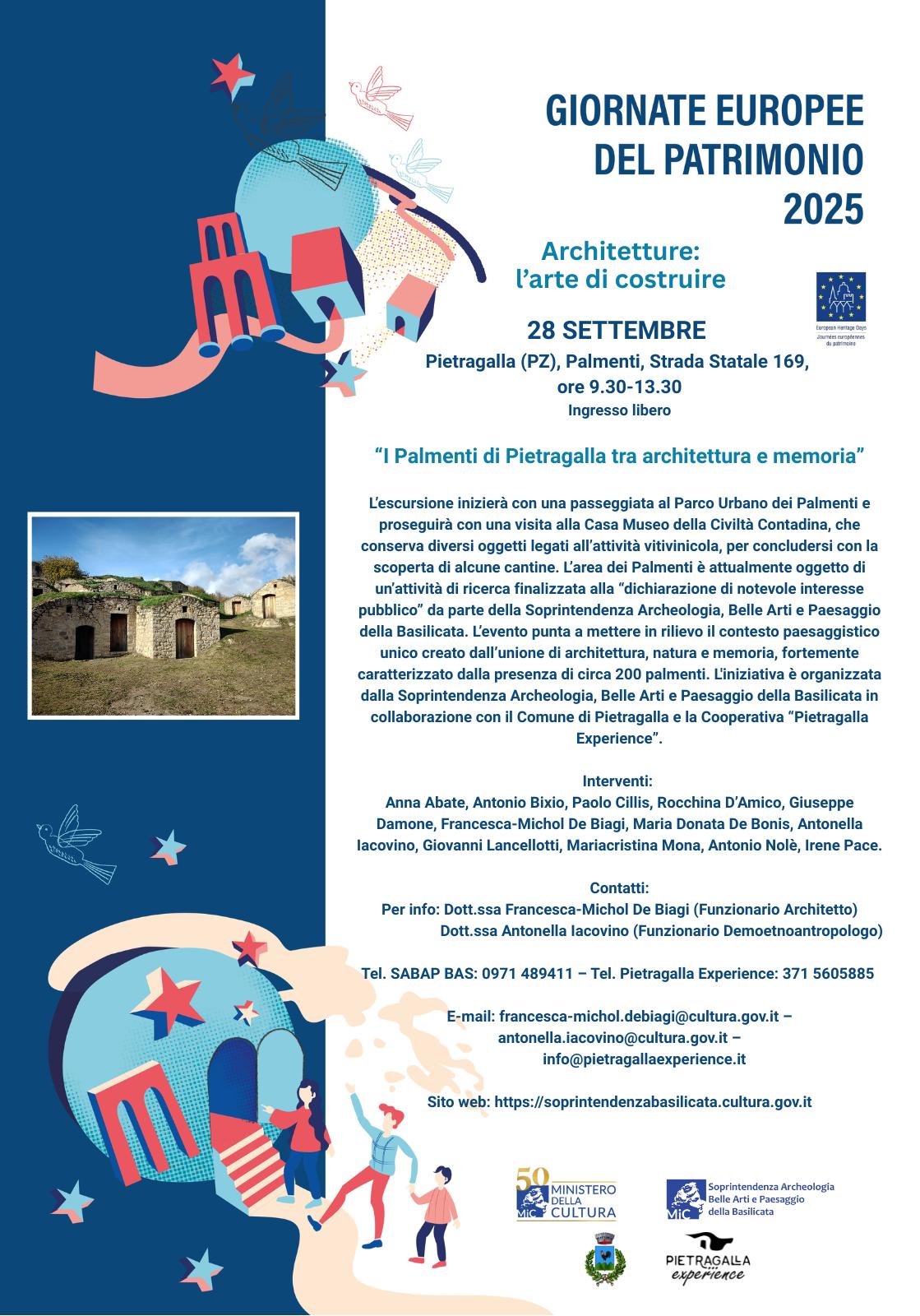 L’escursione inizierà con una passeggiata al Parco Urbano dei Palmenti e proseguirà con una visita alla Casa Museo della Civiltà Contadina, che conserva diversi oggetti legati all’attività vitivinicola, per concludersi con la scoperta di alcune cantine. L’area dei Palmenti è attualmente oggetto di un’attività di ricerca finalizzata alla “dichiarazione di notevole interesse pubblico” da parte della Soprintendenza Archeologia, Belle Arti e Paesaggio della Basilicata. L’evento punta a mettere in rilievo il contesto paesaggistico unico creato dall’unione di architettura, natura e memoria, fortemente caratterizzato dalla presenza di circa 200 palmenti. L'iniziativa è organizzata dalla Soprintendenza Archeologia, Belle Arti e Paesaggio della Basilicata in collaborazione con il Comune di Pietragalla e la Cooperativa “Pietragalla Experience”. Interventi: Anna Abate, Antonio Bixio, Paolo Cillis, Rocchina D’Amico, Giuseppe Damone, Francesca-Michol De Biagi, Maria Donata De Bonis, Antonella Iacovino, Giovanni Lancellotti, Mariacristina Mona, Antonio Nolè, Irene Pace. Appuntamento alle ore 9:30 presso il Parco Urbano dei Palmenti. © 2021 MiC - Pubblicato il 2025-09-24 09:34:13 / Ultimo aggiornamento 2025-09-24 13:24:12