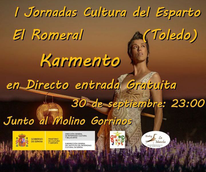 Presentación del libro "El esparto, sus técnicas, su cultura" escrito por D. José Alfonso Mansanet. Celebrada el día 30 de septiembre de 2023 CONCIERTO de KARMENTO Karmen y su banda, castellano manchegos, nos acompañaron con sus seguidillas, cultura musical manchega con un su propio toque moderno para terminar el primer día, 30 de septiembre 2023, de las jornadas de la cultura del esparto Este concierto se celebró en la crestería manchega delante de un molino de viento, molino "Gorrinos"