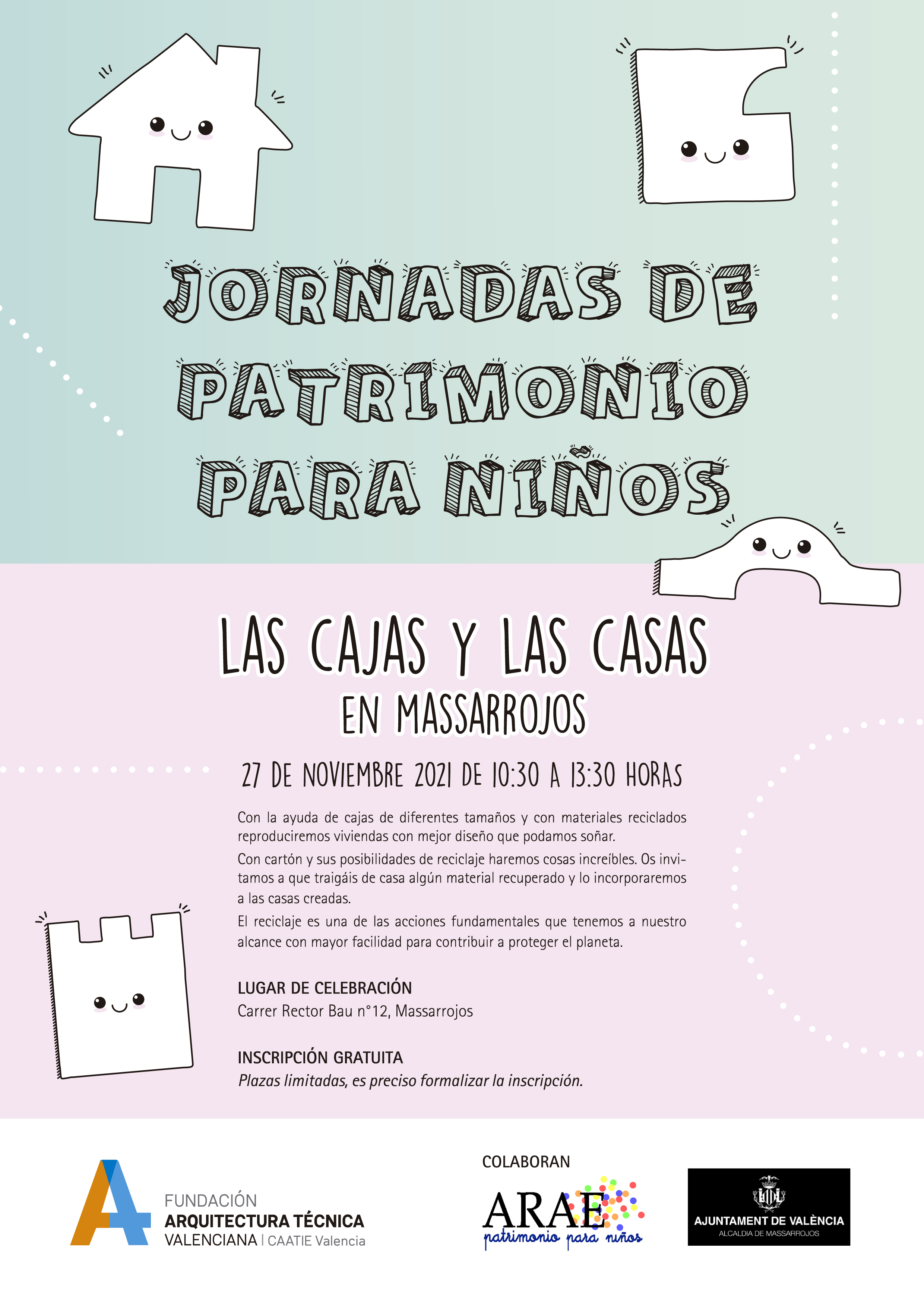Esta es una jornada dentro de una serie de 8 actividades a lo largo del curso 2021-2022 programadas por el Colegio de Arquitectos Técnicos y Aparejadores de Valencia y el equipo de ARAE Patrimonio para niños. En esta ocasión nos desplazamos hasta la pedanía de Massarrojos, con la colaboración del Ayuntamiento de València.